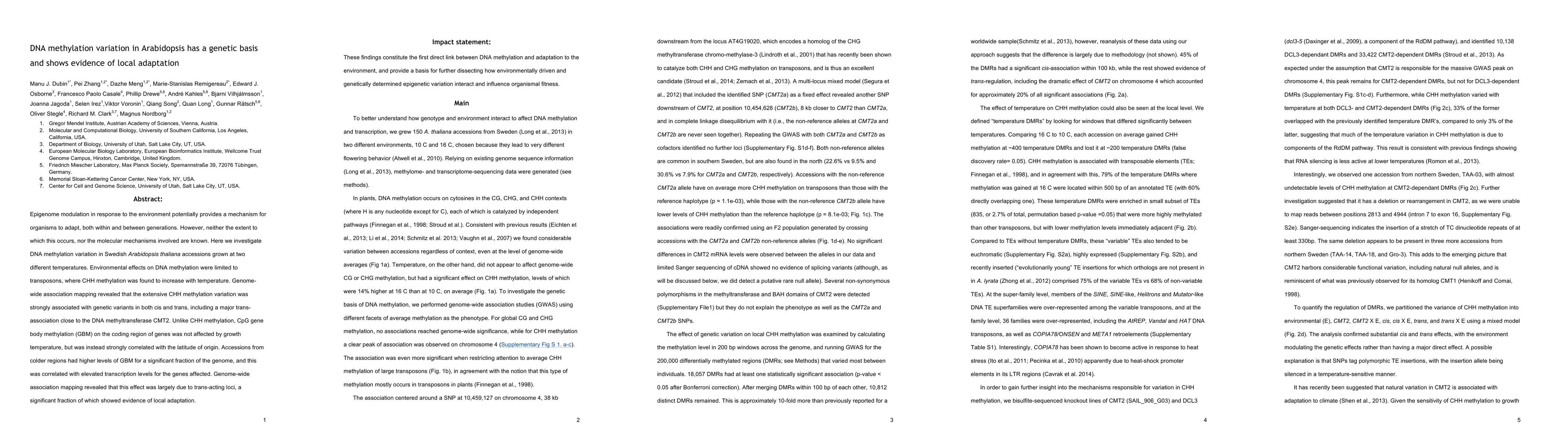 This study reveals that DNA methylation in Arabidopsis thaliana is genetically determined and exhibits evidence of local adaptation. Environmental effects on methylation were limited to transposons, while CpG methylation in gene bodies correlated with the latitude of origin, suggesting adaptation to local climates.