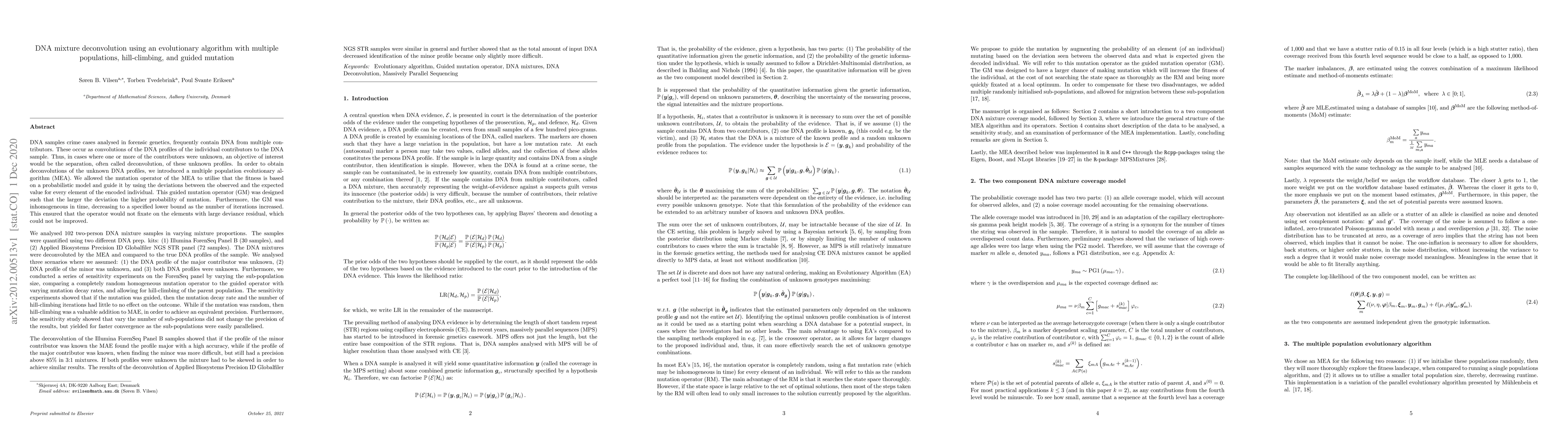 This paper proposes a multiple population evolutionary algorithm (MEA) for deconvolving DNA mixtures in forensic genetics, utilizing guided mutation to enhance accuracy. The algorithm was tested on 102 samples, achieving deconvolution in scenarios where either or both contributors' profiles were unknown.