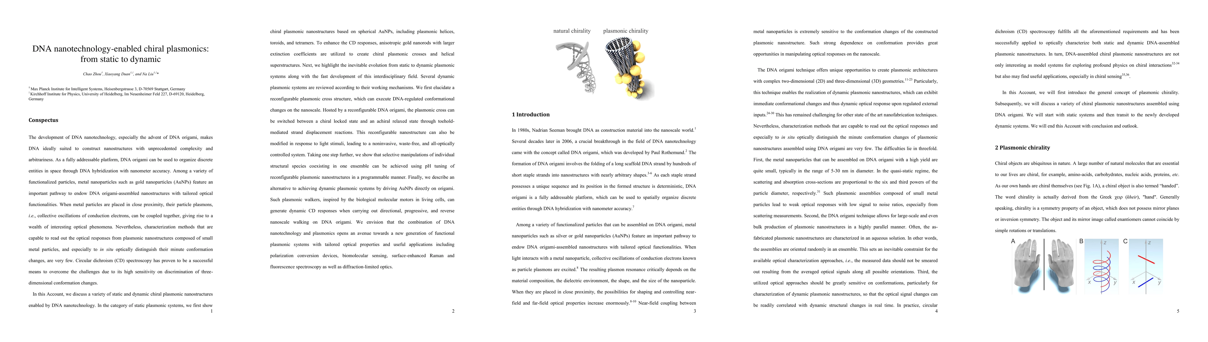 In this Account, we discuss a variety of static and dynamic chiral plasmonic nanostructures enabled by DNA nanotechnology. In the category of static plasmonic systems, we first show chiral plasmonic nanostructures based on spherical AuNPs, including plasmonic helices, toroids, and tetramers. To enhance the CD responses, anisotropic gold nanorods with larger extinction coefficients are utilized to create chiral plasmonic crosses and helical superstructures. Next, we highlight the inevitable evolution from static to dynamic plasmonic systems along with the fast development of this interdisciplinary field. Several dynamic plasmonic systems are reviewed according to their working mechanisms.