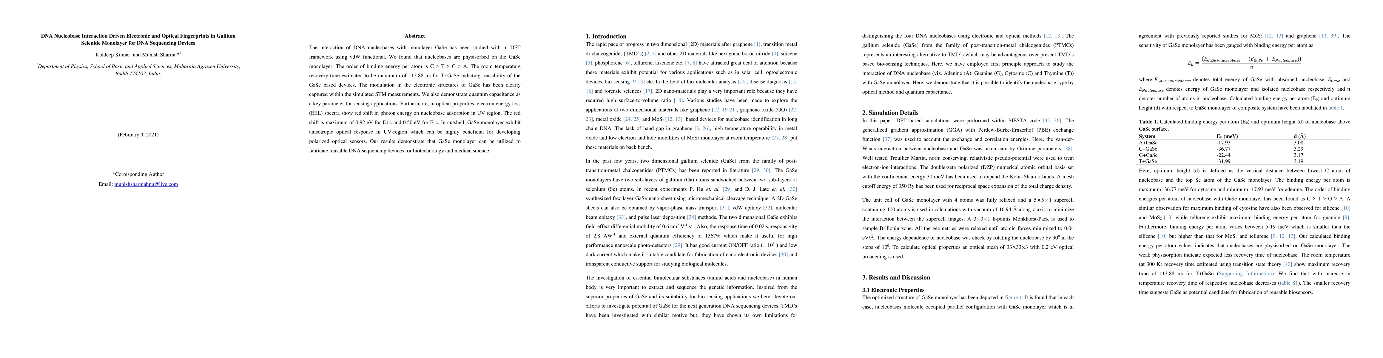 This study explores the interaction of DNA nucleobases with gallium selenide (GaSe) monolayer, revealing physisorption and distinct binding energies. The GaSe monolayer shows potential for reusable DNA sequencing devices, with significant modulation in electronic and optical properties, including a red shift in UV photon energy and anisotropic optical response.