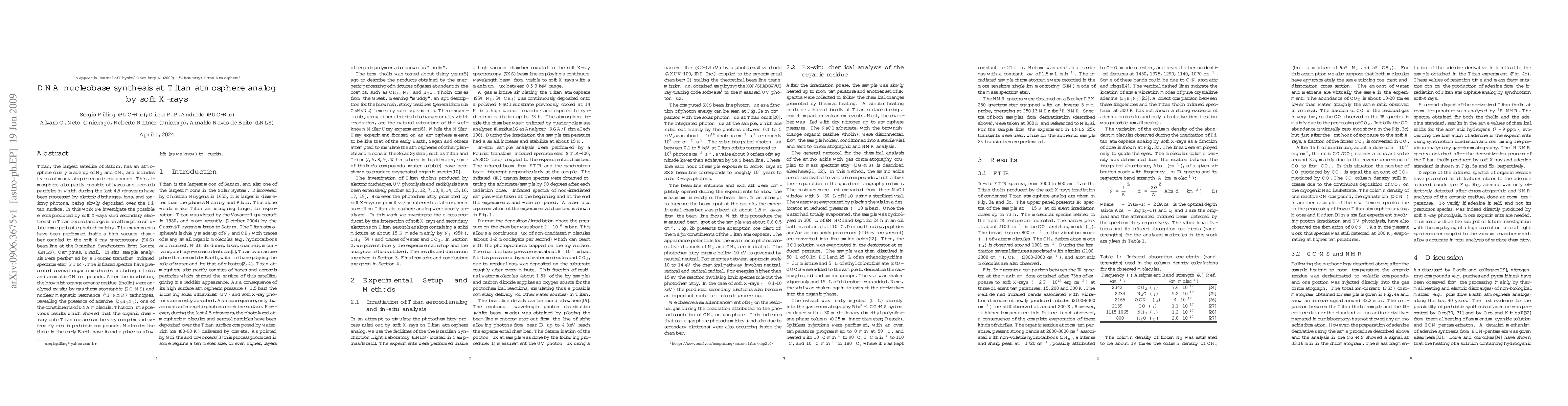This study investigates the synthesis of DNA nucleobases, specifically adenine, under Titan's atmosphere analog conditions using soft X-rays. Experiments reveal the formation of complex organic molecules, including nitriles and aromatic CN compounds, confirming the potential for prebiotic chemistry on Titan.