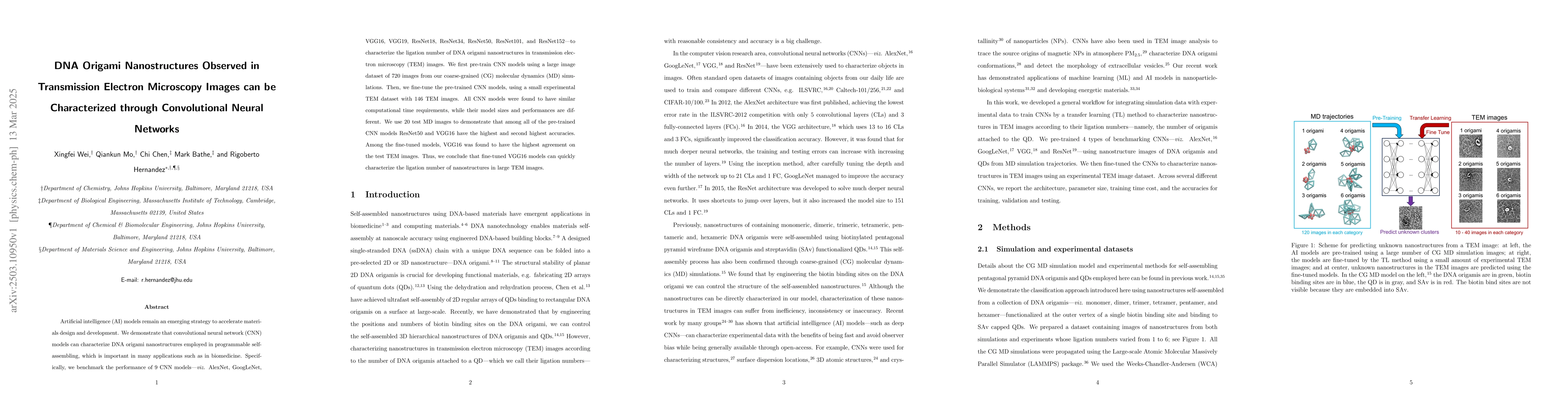 This work is novel in its application of CNNs to characterize DNA origami nanostructures in TEM images, demonstrating that fine-tuned VGG16 models can efficiently and accurately determine ligation numbers, outperforming other tested models and highlighting the potential of AI in materials design and development.