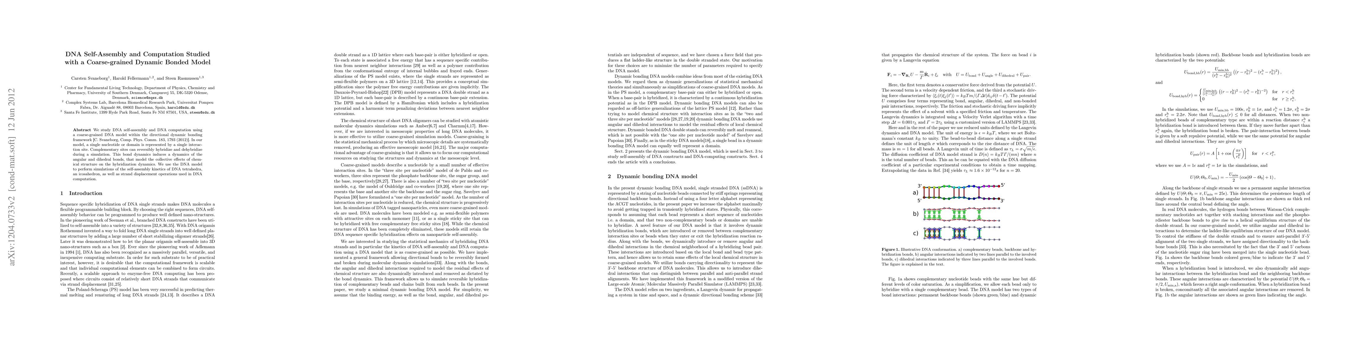 This paper explores DNA self-assembly and computation through a coarse-grained dynamic bonded model, simulating nucleotide hybridization and dehybridization to study the kinetics of DNA structures like tetrahedra and icosahedra, as well as strand displacement operations. The model captures the collective effects of chemical structure on hybridization dynamics.