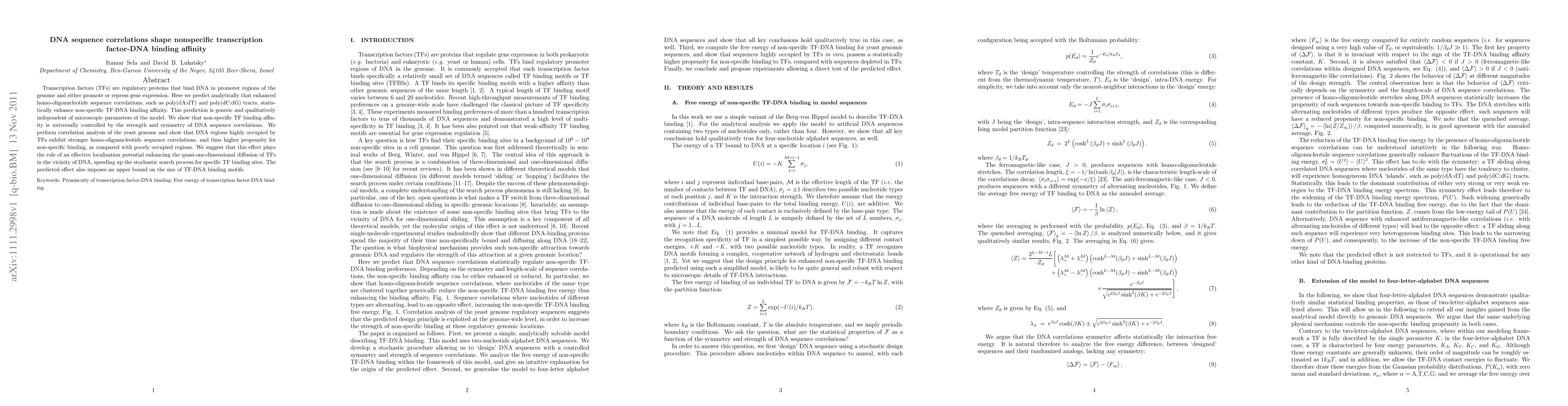 This paper predicts that DNA sequence correlations, such as poly(dA:dT) and poly(dC:dG) tracts, enhance non-specific transcription factor binding affinity, suggesting that these correlations act as an effective localization potential that speeds up the search for specific binding sites. The study supports this prediction through genome-wide correlation analysis in yeast.