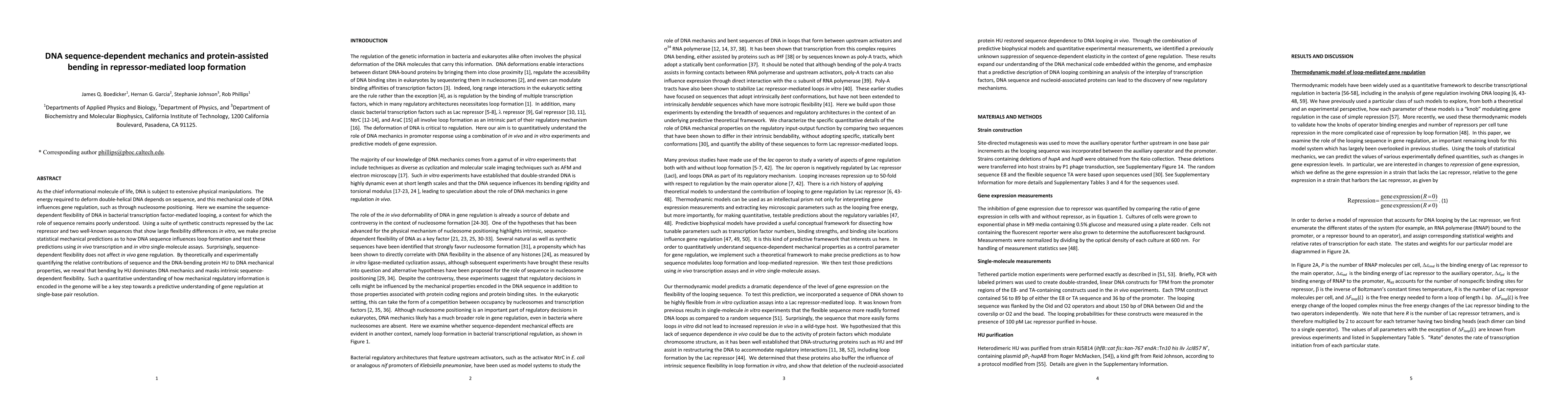 The paper develops a statistical mechanical model to predict how DNA sequence influences loop formation and tests these predictions using in vivo transcription and in vitro single-molecule assays.