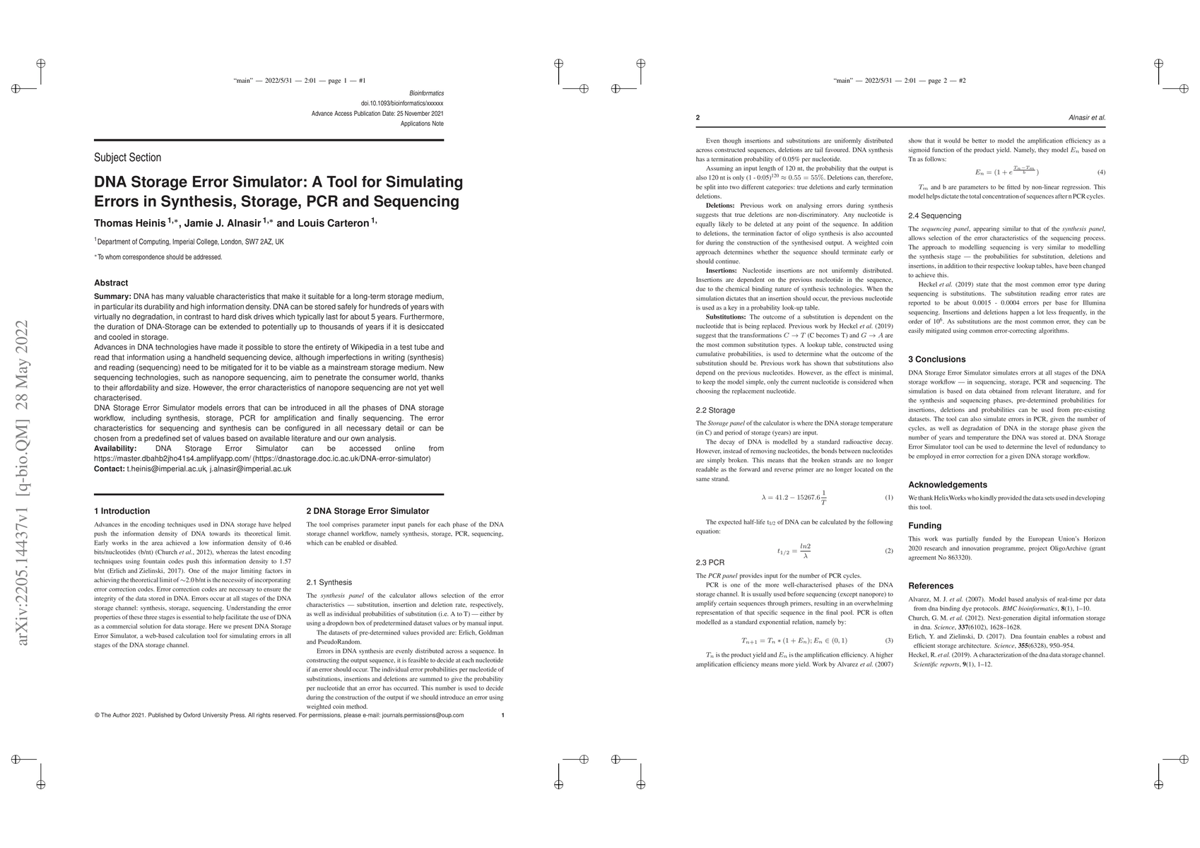 The DNA Storage Error Simulator is a tool designed to model errors in DNA storage processes, including synthesis, storage, PCR amplification, and sequencing. It aims to help researchers understand and mitigate imperfections in DNA storage technologies, which are crucial for making DNA storage a viable long-term data storage medium. The tool is available online and can simulate error characteristics based on literature or predefined values, facilitating the development of advanced DNA storage solutions.