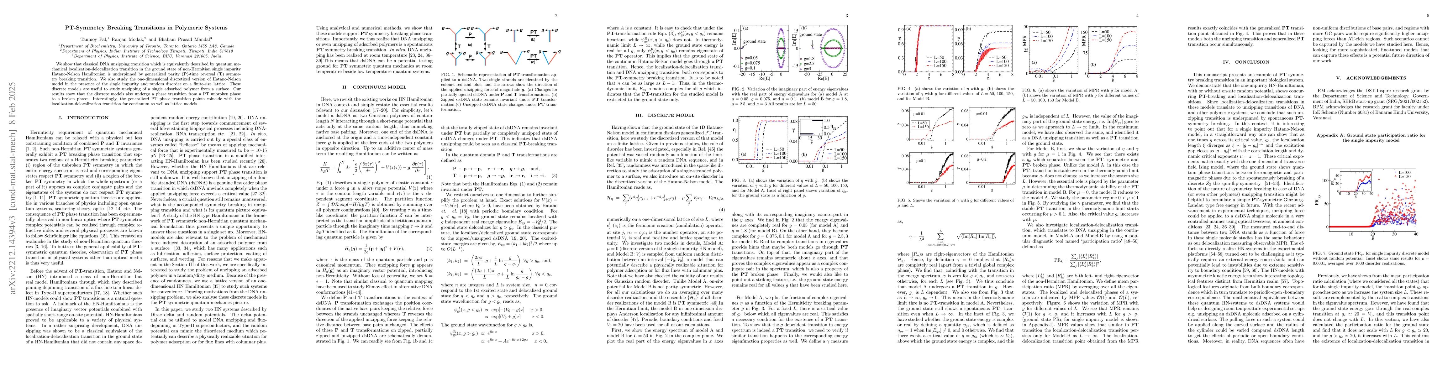 This paper explores the classical DNA unzipping transition through the lens of quantum mechanics, demonstrating that it corresponds to a generalized PT-symmetry breaking transition. The study also investigates the Hatano-Nelson model with impurities and quasiperiodic potentials, revealing phase transitions from PT-symmetric to PT-broken states that align with localization-delocalization transitions.
