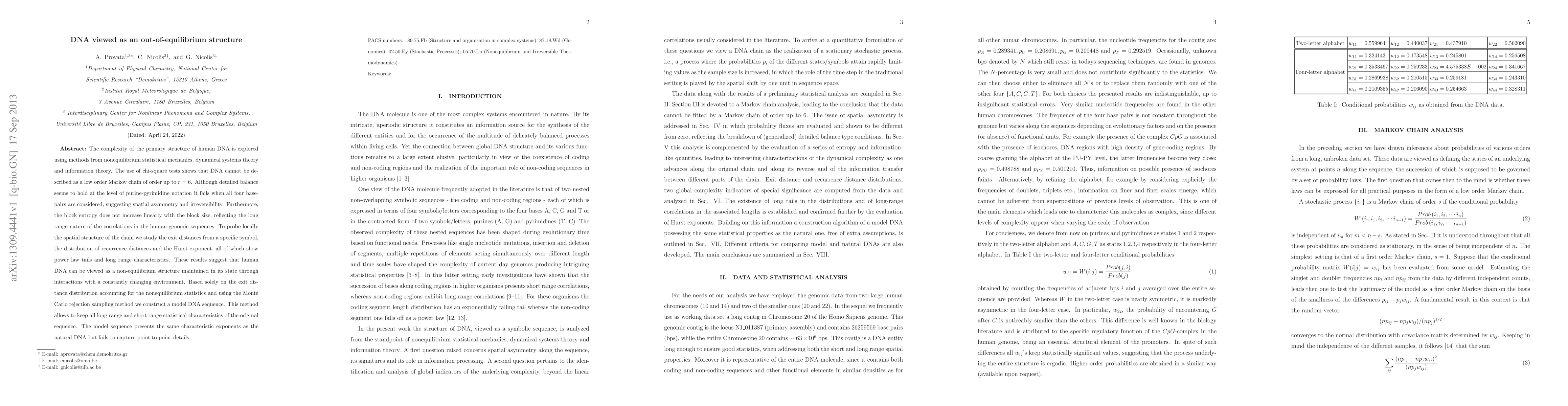The complexity of the primary structure of human DNA is explored using methods from nonequilibrium statistical mechanics, dynamical systems theory and information theory. The use of chi-square tests shows that DNA cannot be described as a low order Markov chain of order up to $r=6$. Although detailed balance seems to hold at the level of purine-pyrimidine notation it fails when all four basepairs are considered, suggesting spatial asymmetry and irreversibility. Furthermore, the block entropy does not increase linearly with the block size, reflecting the long range nature of the correlations in the human genomic sequences. To probe locally the spatial structure of the chain we study the exit distances from a specific symbol, the distribution of recurrence distances and the Hurst exponent, all of which show power law tails and long range characteristics. These results suggest that human DNA can be viewed as a non-equilibrium structure maintained in its state through interactions with a constantly changing environment. Based solely on the exit distance distribution accounting for the nonequilibrium statistics and using the Monte Carlo rejection sampling method we construct a model DNA sequence. This method allows to keep all long range and short range statistical characteristics of the original sequence. The model sequence presents the same characteristic exponents as the natural DNA but fails to capture point-to-point details.