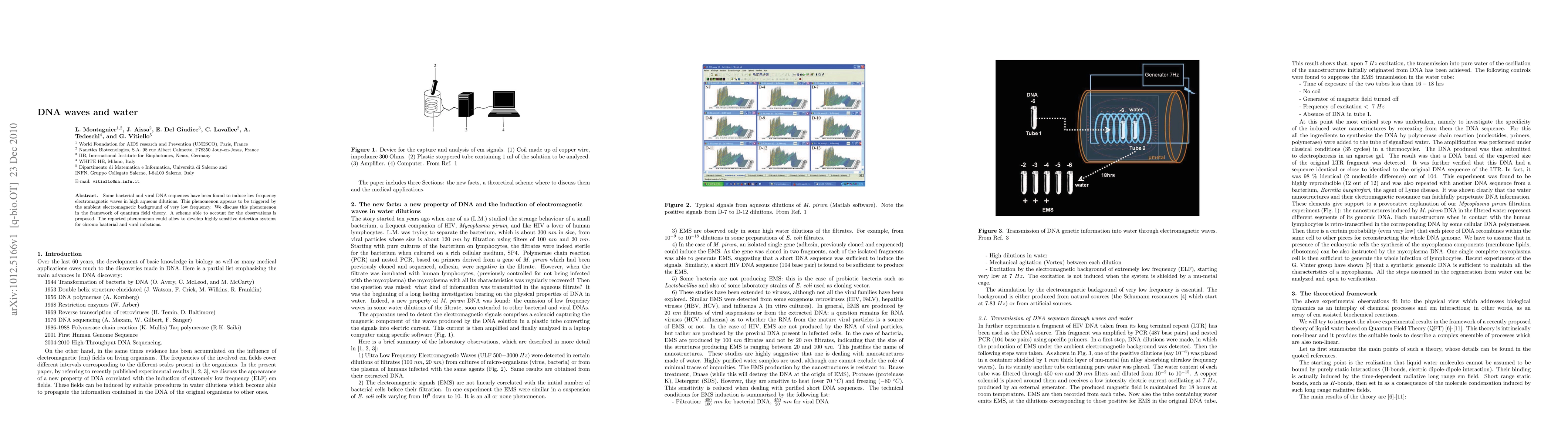Some bacterial and viral DNA sequences have been found to induce low frequency electromagnetic waves in high aqueous dilutions. This phenomenon appears to be triggered by the ambient electromagnetic background of very low frequency. We discuss this phenomenon in the framework of quantum field theory. A scheme able to account for the observations is proposed. The reported phenomenon could allow to develop highly sensitive detection systems for chronic bacterial and viral infections.