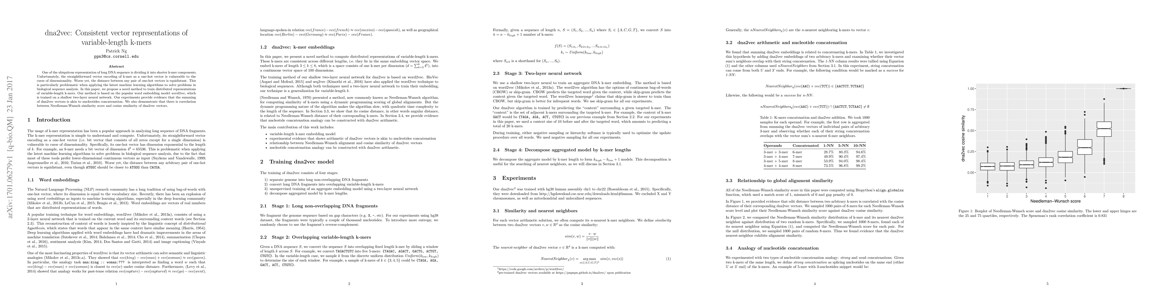 One of the ubiquitous representation of long DNA sequence is dividing it into shorter k-mer components. Unfortunately, the straightforward vector encoding of k-mer as a one-hot vector is vulnerable to the curse of dimensionality. Worse yet, the distance between any pair of one-hot vectors is equidistant. This is particularly problematic when applying the latest machine learning algorithms to solve problems in biological sequence analysis. In this paper, we propose a novel method to train distributed representations of variable-length k-mers. Our method is based on the popular word embedding model word2vec, which is trained on a shallow two-layer neural network. Our experiments provide evidence that the summing of dna2vec vectors is akin to nucleotides concatenation. We also demonstrate that there is correlation between Needleman-Wunsch similarity score and cosine similarity of dna2vec vectors.