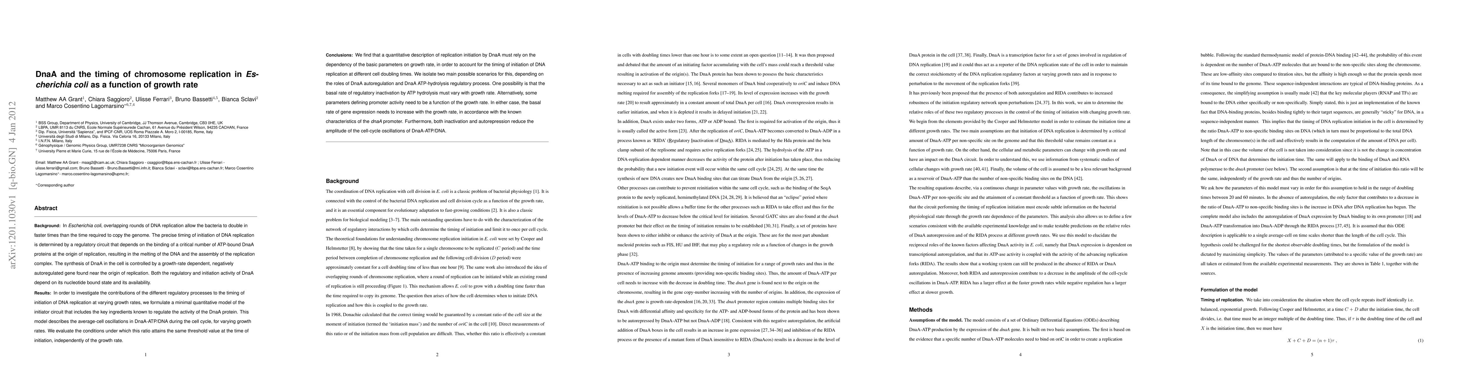 This paper investigates the regulatory mechanisms governing DNA replication initiation in Escherichia coli, focusing on the role of DnaA protein and its dependence on growth rate. The study formulates a quantitative model to describe how varying growth rates affect the timing of DNA replication initiation, concluding that the basal rate of gene expression or the rate of regulatory inactivation must adjust with growth rate to maintain initiation timing.