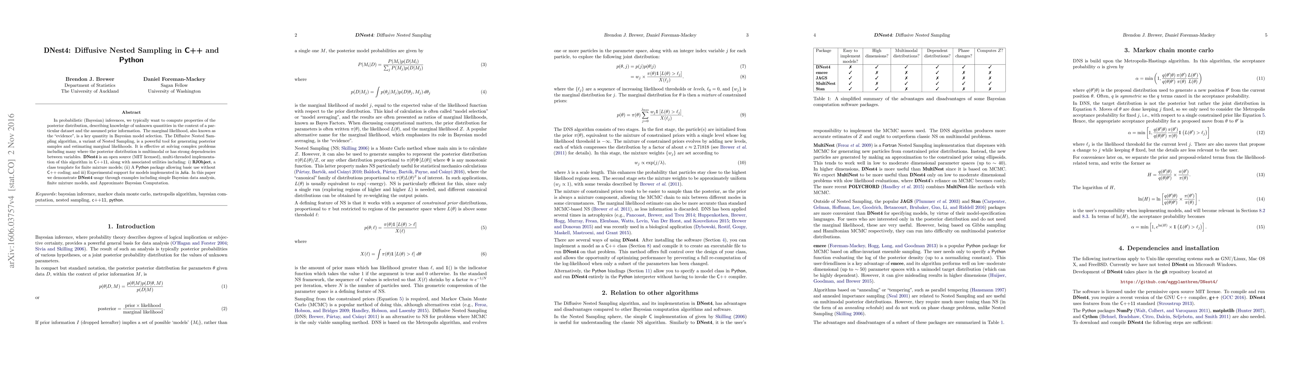 DNest4 is an open-source, multi-threaded implementation of the Diffusive Nested Sampling algorithm in C++11, with a Python package for user-friendly access, designed for efficient Bayesian inference and complex posterior distribution analysis. It supports finite mixture models and experimental Julia integration.