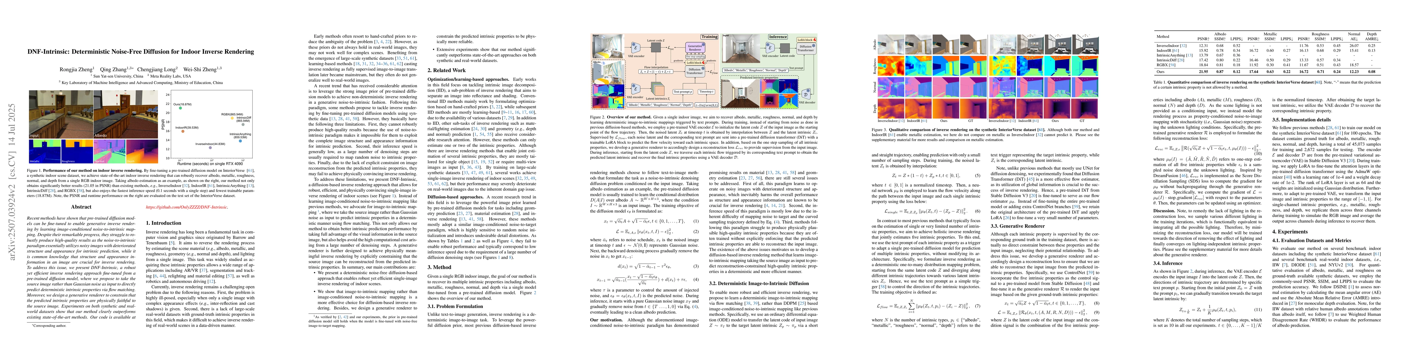 The paper introduces DNF-Intrinsic, a deterministic noise-free diffusion method for indoor inverse rendering, which fine-tunes a pre-trained diffusion model to predict intrinsic properties directly from source images using flow matching. A generative renderer ensures the predicted intrinsic properties are physically faithful to the source image.