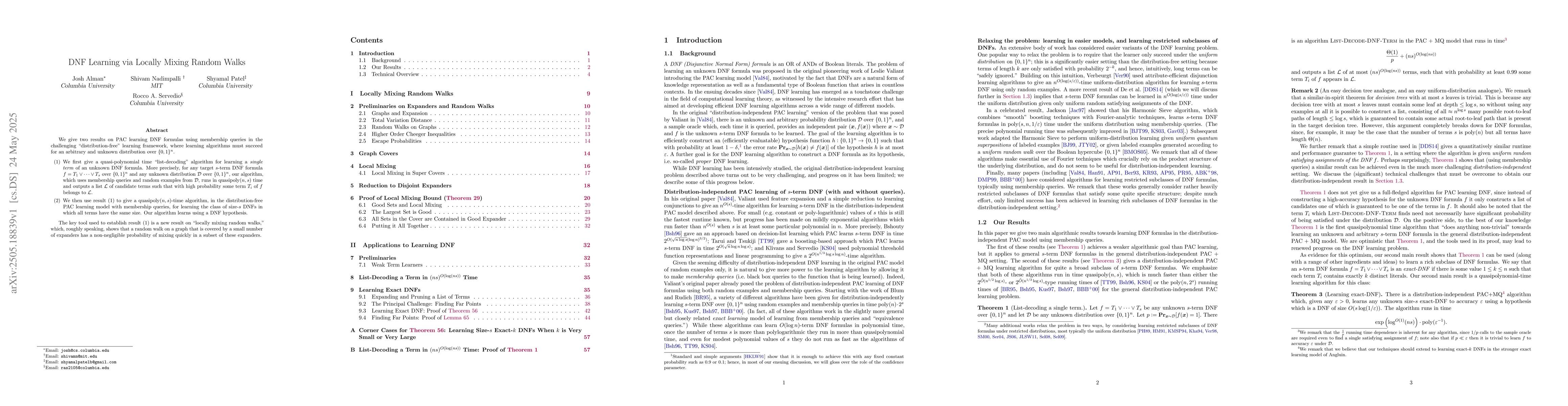 This work presents new techniques for DNF learning under distribution-free settings, specifically through the lens of locally mixing random walks, which have not been previously applied in this context.