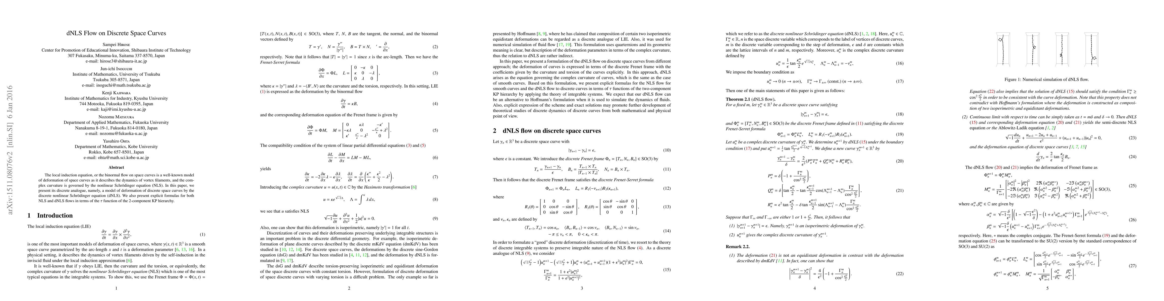 The local induction equation, or the binormal flow on space curves is a well-known model of deformation of space curves as it describes the dynamics of vortex filaments, and the complex curvature is governed by the nonlinear Schr\"odinger equation (NLS). In this paper, we present its discrete analogue, namely, a model of deformation of discrete space curves by the discrete nonlinear Schr\"odinger equation (dNLS). We also present explicit formulas for both NLS and dNLS flows in terms of the $\tau$ function of the 2-component KP hierarchy.