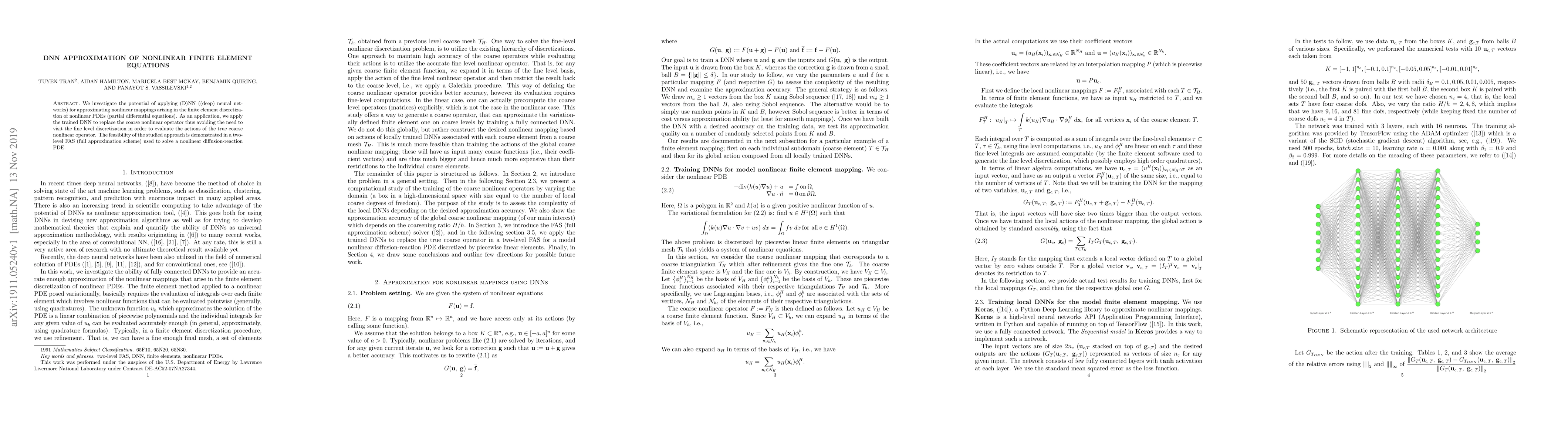 This paper explores the use of deep neural networks (DNN) to approximate nonlinear mappings in finite element methods for solving nonlinear PDEs, demonstrating the approach via a two-level FAS scheme applied to a nonlinear diffusion-reaction PDE, thereby reducing the computational cost by replacing the coarse nonlinear operator.