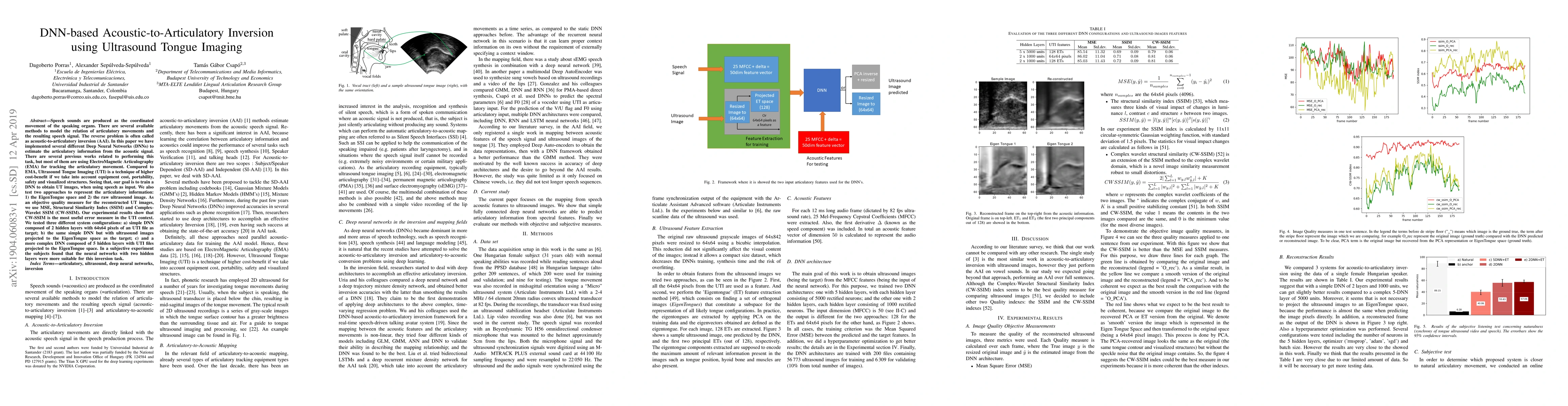 This paper explores the use of Deep Neural Networks (DNNs) for acoustic-to-articulatory inversion using Ultrasound Tongue Imaging (UTI) instead of ElectroMagnetic Articulography (EMA). The study compares different DNN configurations and evaluation metrics, finding that Complex-Wavelet SSIM (CW-SSIM) is the most effective for assessing reconstructed UT images.