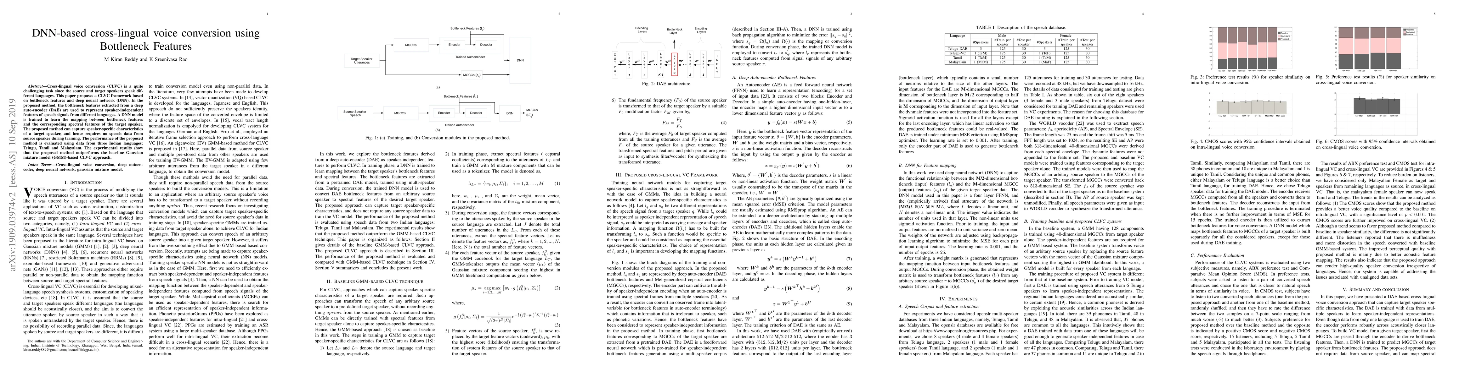 This paper proposes a cross-lingual voice conversion framework using DNN and bottleneck features from a deep auto-encoder, which effectively maps source language features to target speaker characteristics without requiring source speaker data. Experimental results show superior performance over baseline GMM-based methods using Telugu, Tamil, and Malayalam languages.