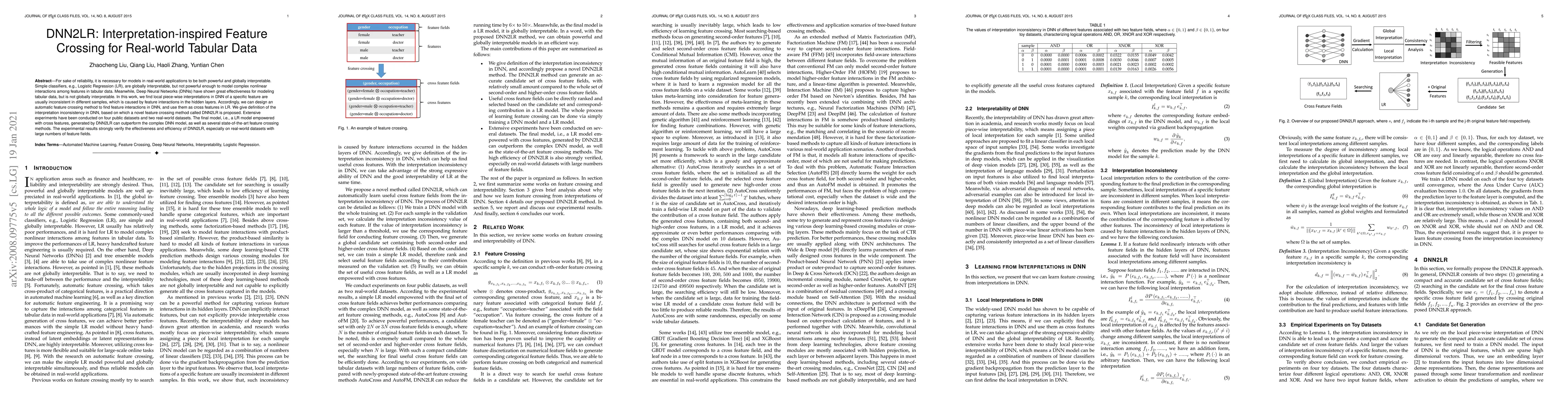 For sake of reliability, it is necessary for models in real-world applications to be both powerful and globally interpretable. Simple classifiers, e.g., Logistic Regression (LR), are globally interpretable, but not powerful enough to model complex nonlinear interactions among features in tabular data. Meanwhile, Deep Neural Networks (DNNs) have shown great effectiveness for modeling tabular data, but is not globally interpretable. In this work, we find local piece-wise interpretations in DNN of a specific feature are usually inconsistent in different samples, which is caused by feature interactions in the hidden layers. Accordingly, we can design an automatic feature crossing method to find feature interactions in DNN, and use them as cross features in LR. We give definition of the interpretation inconsistency in DNN, based on which a novel feature crossing method called DNN2LR is proposed. Extensive experiments have been conducted on four public datasets and two real-world datasets. The final model, i.e., a LR model empowered with cross features, generated by DNN2LR can outperform the complex DNN model, as well as several state-of-the-art feature crossing methods. The experimental results strongly verify the effectiveness and efficiency of DNN2LR, especially on real-world datasets with large numbers of feature fields.