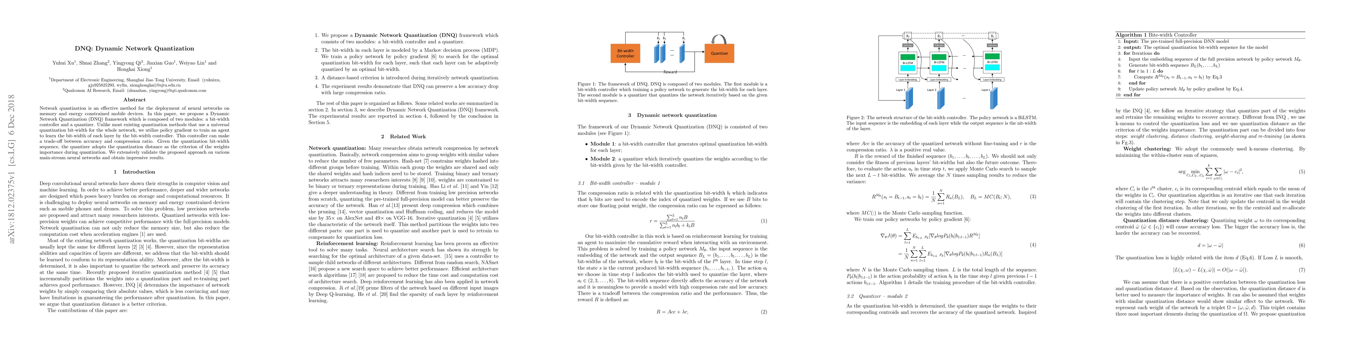 Network quantization is an effective method for the deployment of neural networks on memory and energy constrained mobile devices. In this paper, we propose a Dynamic Network Quantization (DNQ) framework which is composed of two modules: a bit-width controller and a quantizer. Unlike most existing quantization methods that use a universal quantization bit-width for the whole network, we utilize policy gradient to train an agent to learn the bit-width of each layer by the bit-width controller. This controller can make a trade-off between accuracy and compression ratio. Given the quantization bit-width sequence, the quantizer adopts the quantization distance as the criterion of the weights importance during quantization. We extensively validate the proposed approach on various main-stream neural networks and obtain impressive results.