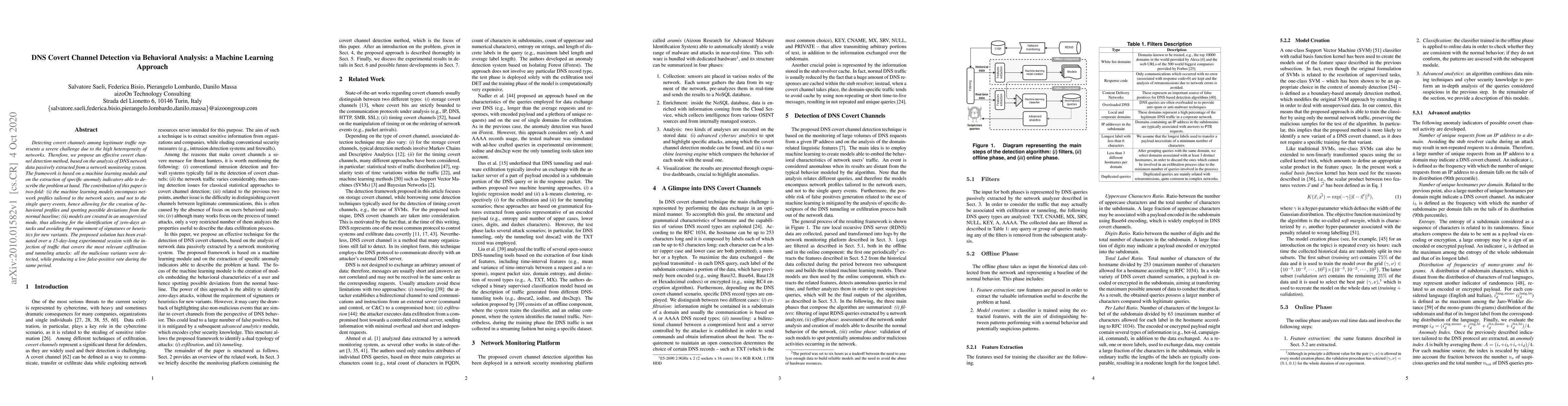 This paper proposes a machine learning-based method for detecting covert channels in DNS traffic through behavioral analysis, focusing on creating network profiles for users rather than individual query events. The unsupervised models enable the identification of zero-day attacks without requiring signatures, and were successfully tested with a low false-positive rate.
