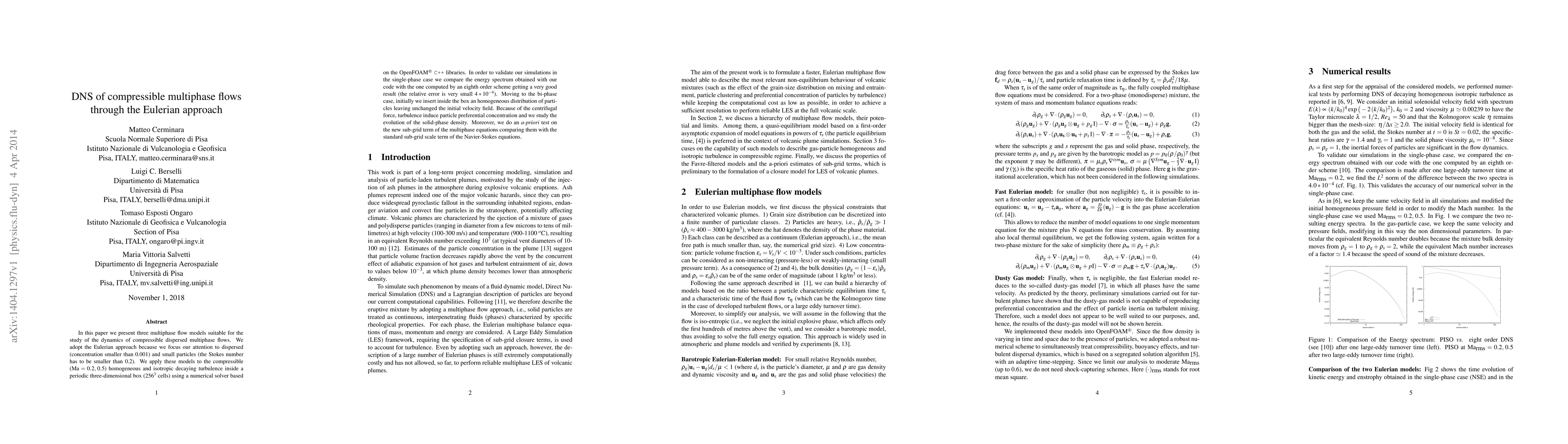In this paper we present three multiphase flow models suitable for the study of the dynamics of compressible dispersed multiphase flows. We adopt the Eulerian approach because we focus our attention to dispersed (concentration smaller than 0.001) and small particles (the Stokes number has to be smaller than 0.2). We apply these models to the compressible ($\text{Ma} = 0.2,\,0.5$) homogeneous and isotropic decaying turbulence inside a periodic three-dimensional box ($256^3$ cells) using a numerical solver based on the OpenFOAM$^{R}$ C++ libraries. In order to validate our simulations in the single-phase case we compare the energy spectrum obtained with our code with the one computed by an eighth order scheme getting a very good result (the relative error is very small $4*10^{-4}$). Moving to the bi-phase case, initially we insert inside the box an homogeneous distribution of particles leaving unchanged the initial velocity field. Because of the centrifugal force, turbulence induce particle preferential concentration and we study the evolution of the solid-phase density. Moreover, we do an {\em a-priori} test on the new sub-grid term of the multiphase equations comparing them with the standard sub-grid scale term of the Navier-Stokes equations.