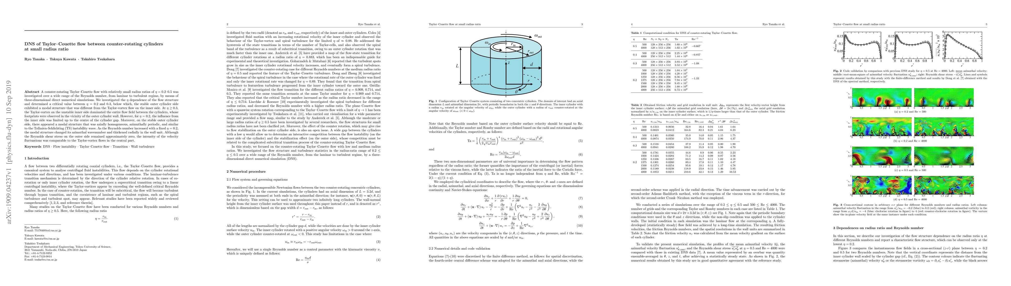 A counter-rotating Taylor-Couette flow with relatively small radius ratios of $\eta$ = 0.2--0.5 was investigated over a wide range of the Reynolds number, from laminar to turbulent regime, by means of three-dimensional direct numerical simulations. We investigated the $\eta$ dependence of the flow structure and determined a critical value between $\eta$ = 0.2 and 0.3, below which, the stable outer cylinder side exhibited a modal structure that was different from the Taylor-vortex flow on the inner side. At $\eta \geq$ 0.3, the Taylor-vortex on the unstable inner side dominated the entire flow field between the cylinders, whose footprints were observed in the vicinity of the outer cylinder wall. However, for $\eta$ = 0.2, the influence from the inner side was limited up to the centre of the cylinder gap. Moreover, on the stable outer cylinder side, there appeared a modal structure that was axially homogeneous, azimuthally periodic, and similar to the Tollmien-Schlichting (TS) instability wave. As the Reynolds number increased with a fixed $\eta$ = 0.2, the modal structure changed its azimuthal wavenumber and thickened radially in the wall unit. Although the Reynolds shear stress on the outer side remained approximately zero, the intensity of the velocity fluctuations was comparable to the Taylor-vortex flows in the central part.