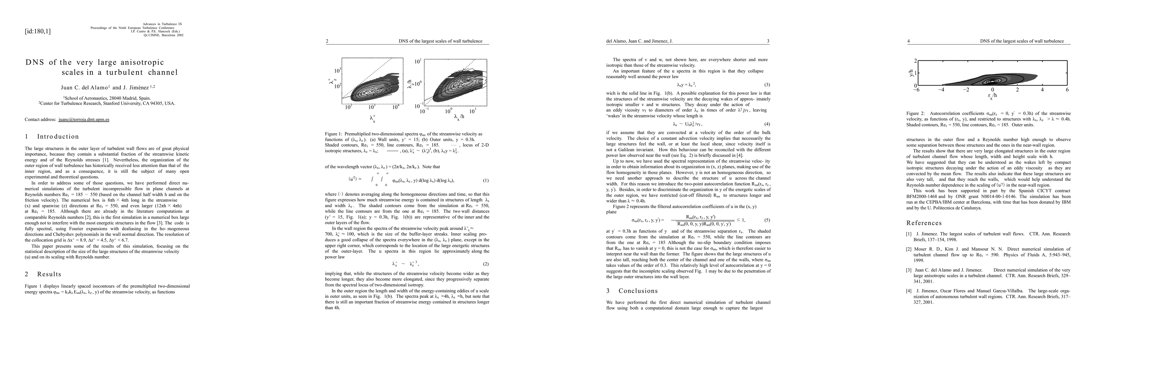 The large structures in the outer layer of turbulent wall flows are of great physical importance, because they contain a substantial fraction of the streamwise kinetic energy and of the Reynolds stresses. Nevertheless, the organization of the outer region of wall turbulence has historically received less attention than that of the inner region, and as a consequence, it is still the subject of many open experimental and theoretical questions. In order to address some of those questions, we have performed direct numerical simulations of the turbulent incompressible flow in plane channels at Reynolds numbers 185 - 550. This paper presents some of the results of this simulation, focusing on the statistical description of the size of the large structures of the streamwise velocity and on its scaling with Reynolds number.
