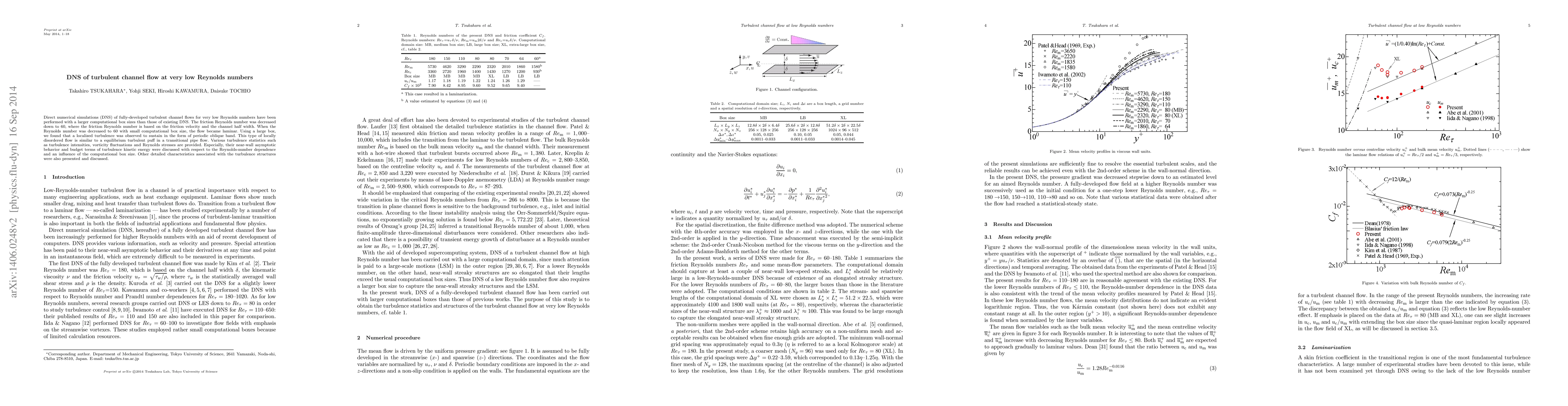 This paper reports on DNS of turbulent channel flows at very low Reynolds numbers, revealing localized turbulence in the form of periodic oblique bands when using larger computational box sizes. The study provides turbulence statistics, discusses near-wall asymptotic behavior, and examines the influence of computational box size on turbulence structures.