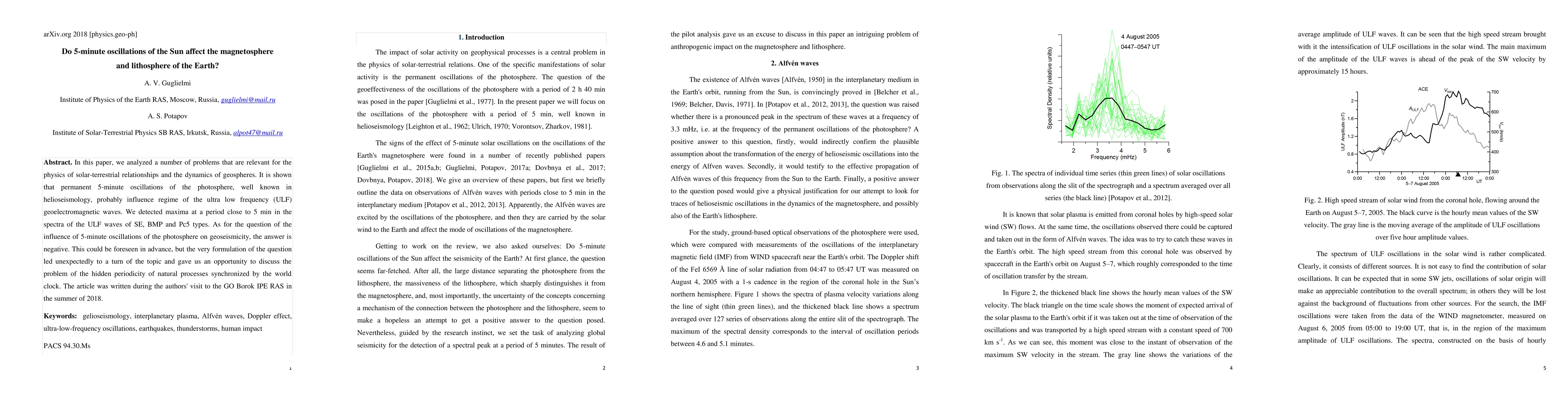 In this paper, we analyzed a number of problems that are relevant for the physics of solar-terrestrial relationships and the dynamics of geospheres. It is shown that permanent 5-minute oscillations of the photosphere, well known in helioseismology, probably influence regime of the ultra low frequency (ULF) geoelectromagnetic waves. We detected maxima at a period close to 5 min in the spectra of the ULF waves of SE, BMP and Pc5 types. As for the question of the influence of 5-minute oscillations of the photosphere on geoseismicity, the answer is negative. This could be foreseen in advance, but the very formulation of the question led unexpectedly to a turn of the topic and gave us an opportunity to discuss the problem of the hidden periodicity of natural processes synchronized by the world clock. The article was written during the authors' visit to the GO Borok IPE RAS in the summer of 2018. Keywords: gelioseismology, interplanetary plasma, Alfv\'en waves, Doppler effect, ultra-low-frequency oscillations, earthquakes, thunderstorms, human impact.