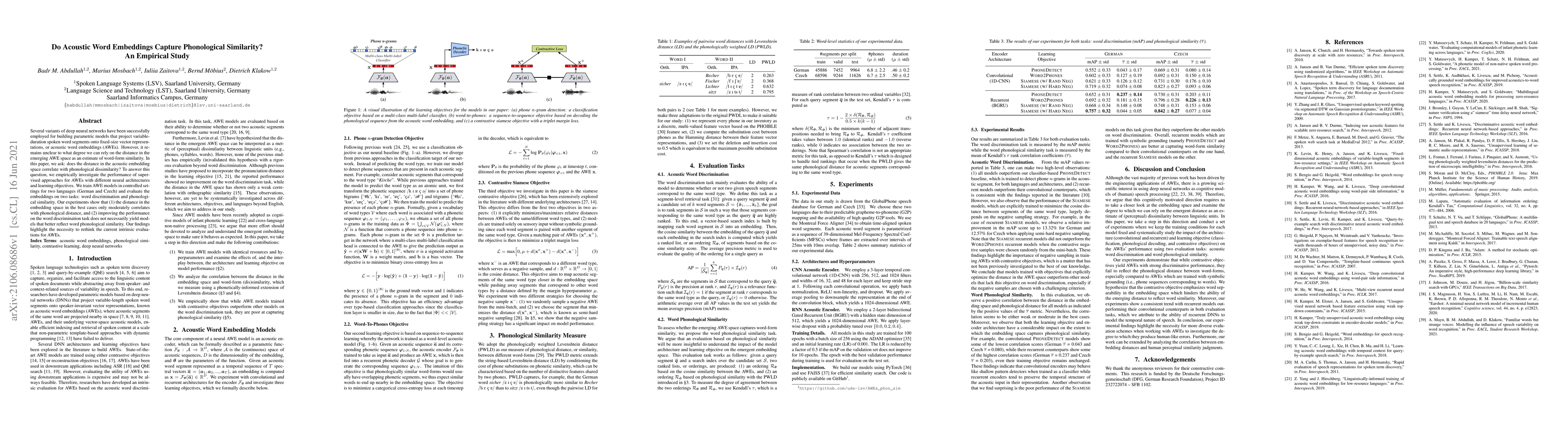 Several variants of deep neural networks have been successfully employed for building parametric models that project variable-duration spoken word segments onto fixed-size vector representations, or acoustic word embeddings (AWEs). However, it remains unclear to what degree we can rely on the distance in the emerging AWE space as an estimate of word-form similarity. In this paper, we ask: does the distance in the acoustic embedding space correlate with phonological dissimilarity? To answer this question, we empirically investigate the performance of supervised approaches for AWEs with different neural architectures and learning objectives. We train AWE models in controlled settings for two languages (German and Czech) and evaluate the embeddings on two tasks: word discrimination and phonological similarity. Our experiments show that (1) the distance in the embedding space in the best cases only moderately correlates with phonological distance, and (2) improving the performance on the word discrimination task does not necessarily yield models that better reflect word phonological similarity. Our findings highlight the necessity to rethink the current intrinsic evaluations for AWEs.