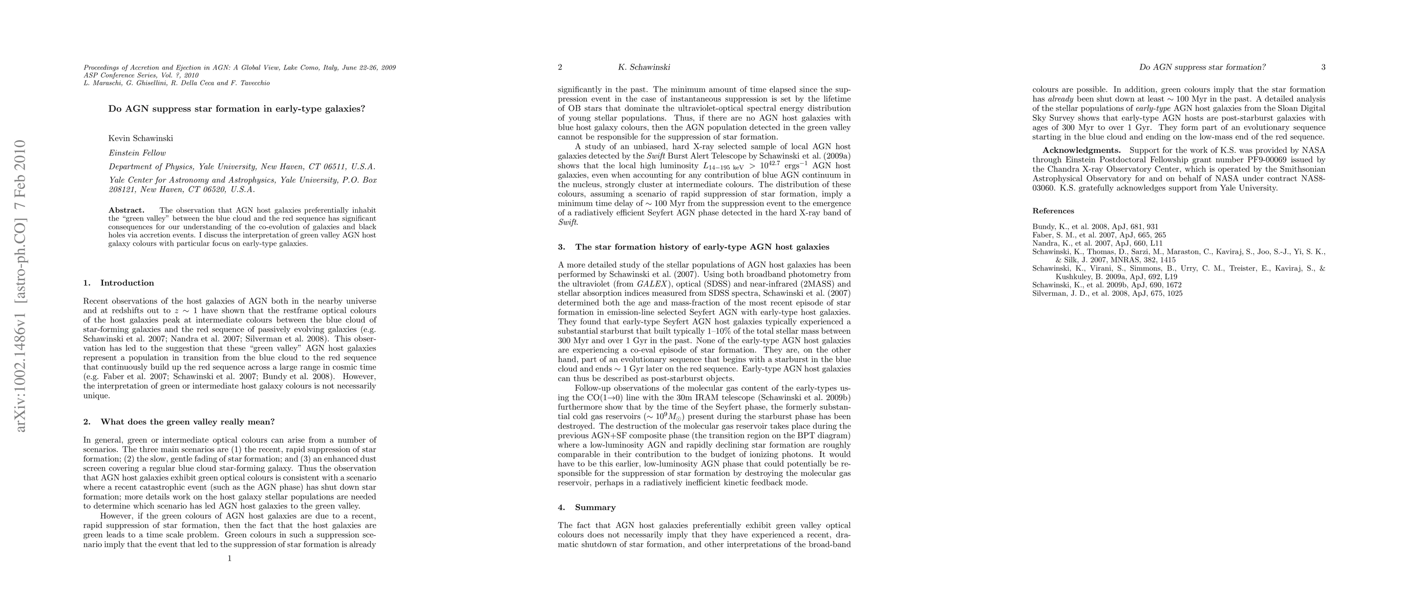 The observation that AGN host galaxies preferentially inhabit the "green valley" between the blue cloud and the red sequence has significant consequences for our understanding of the co-evolution of galaxies and black holes via accretion events. I discuss the interpretation of green valley AGN host galaxy colours with particular focus on early-type galaxies.