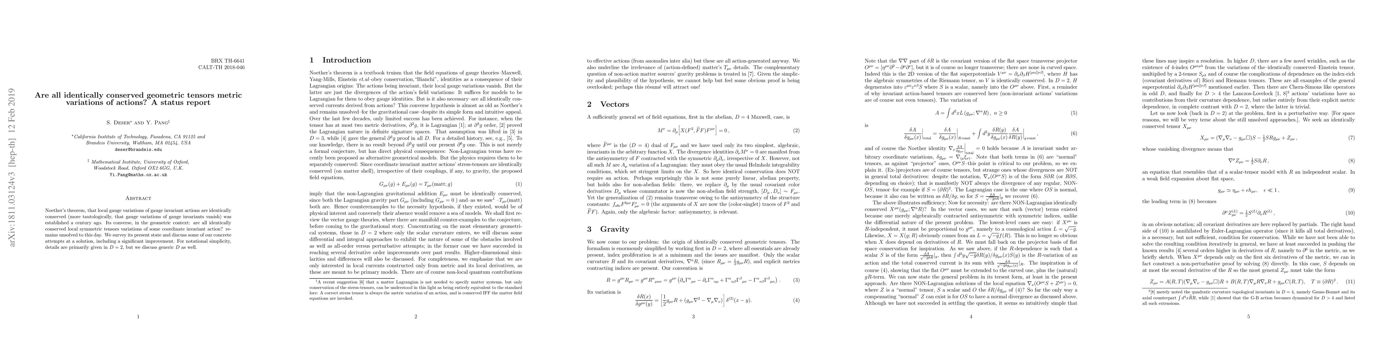 Noether's theorem, that local gauge variations of gauge invariant actions are identically conserved (more tautologically, that gauge variations of gauge invariants vanish) was established a century ago. Its converse, in the geometric context: are all identically conserved local symmetric tensors variations of some coordinate invariant action? remains unsolved to this day. We survey its present state and discuss some of our concrete attempts at a solution, including a significant improvement. For notational simplicity, details are primarily given in $D=2$, but we discuss generic $D$ as well.
