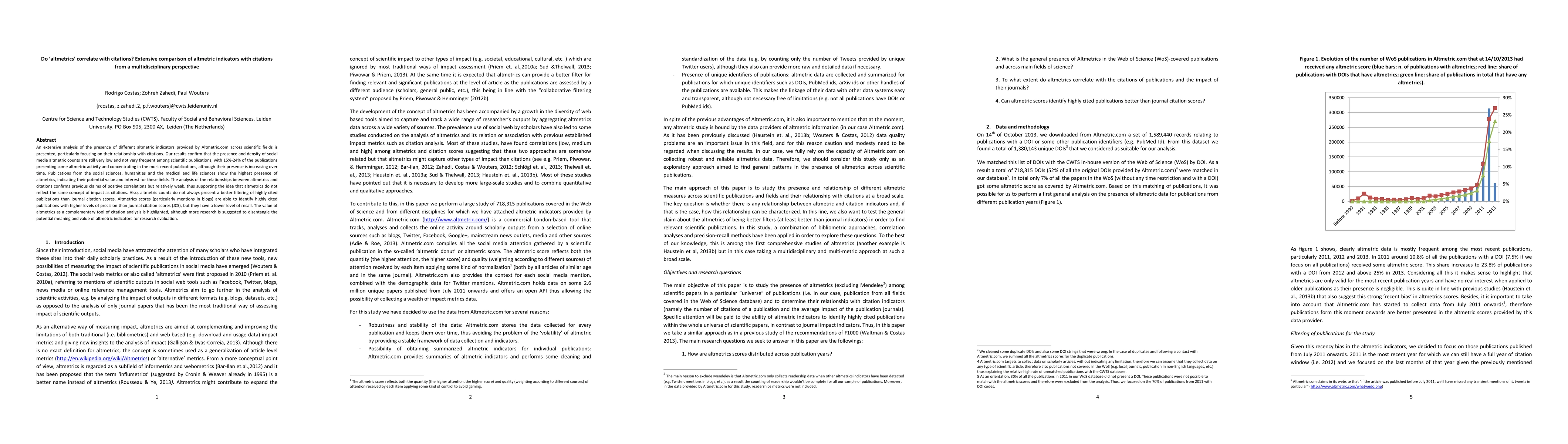 The study investigates the correlation between altmetrics and citations across various disciplines, finding a weak positive relationship. It suggests that while altmetrics can complement citation analysis, they do not fully capture the same impact metrics as traditional citations and require further research to clarify their value in research evaluation.