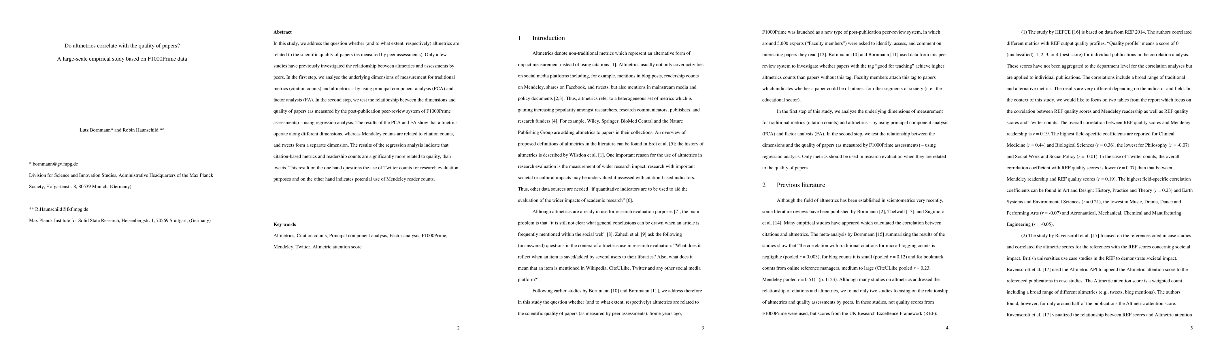 This study investigates the correlation between altmetrics and paper quality, measured by peer assessments from F1000Prime. It finds that altmetrics operate on different dimensions compared to traditional citation metrics, with Mendeley counts correlating with citations and tweets forming a separate dimension. The analysis suggests that citation-based metrics and readership counts are more strongly related to paper quality than tweets.