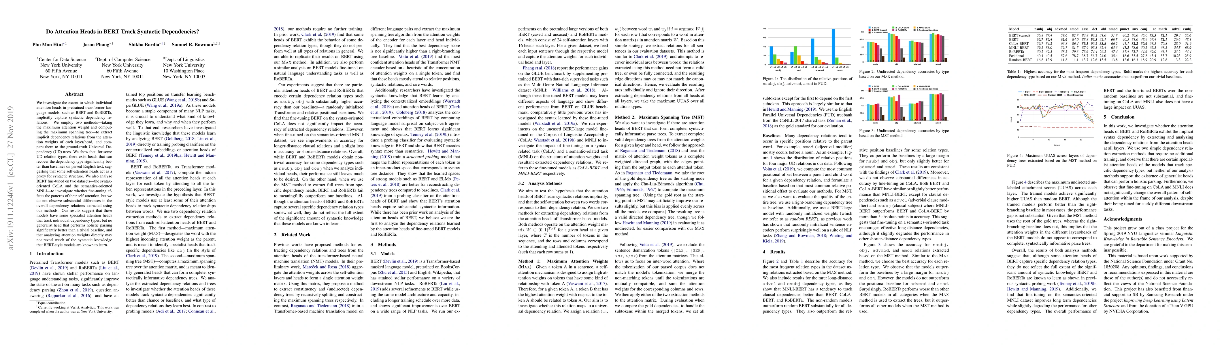 This paper explores if individual attention heads in BERT can implicitly capture syntactic dependencies, finding that some heads can recover specific dependency types better than baselines. It concludes that while some attention heads act as proxies for syntactic structure, no single head performs holistic parsing, and direct attention weight analysis may not fully reveal the syntactic knowledge in BERT.