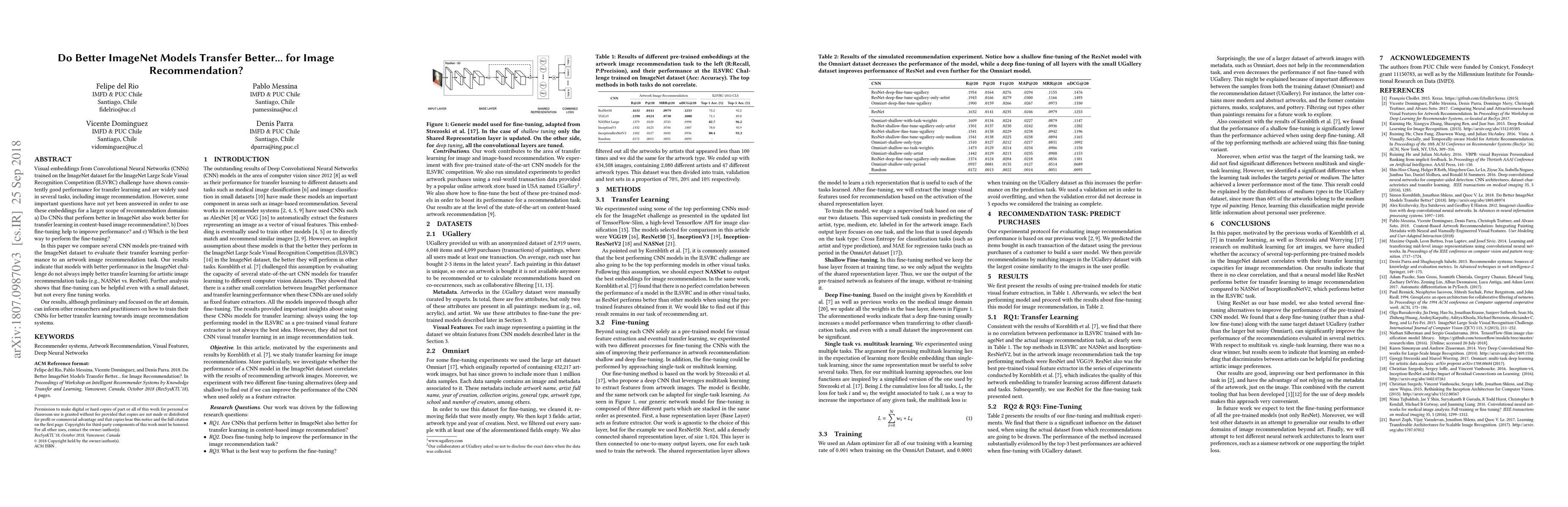 Visual embeddings from Convolutional Neural Networks (CNN) trained on the ImageNet dataset for the ILSVRC challenge have shown consistently good performance for transfer learning and are widely used in several tasks, including image recommendation. However, some important questions have not yet been answered in order to use these embeddings for a larger scope of recommendation domains: a) Do CNNs that perform better in ImageNet are also better for transfer learning in content-based image recommendation?, b) Does fine-tuning help to improve performance? and c) Which is the best way to perform the fine-tuning? In this paper we compare several CNN models pre-trained with ImageNet to evaluate their transfer learning performance to an artwork image recommendation task. Our results indicate that models with better performance in the ImageNet challenge do not always imply better transfer learning for recommendation tasks (e.g. NASNet vs. ResNet). Our results also show that fine-tuning can be helpful even with a small dataset, but not every fine-tuning works. Our results can inform other researchers and practitioners on how to train their CNNs for better transfer learning towards image recommendation systems.