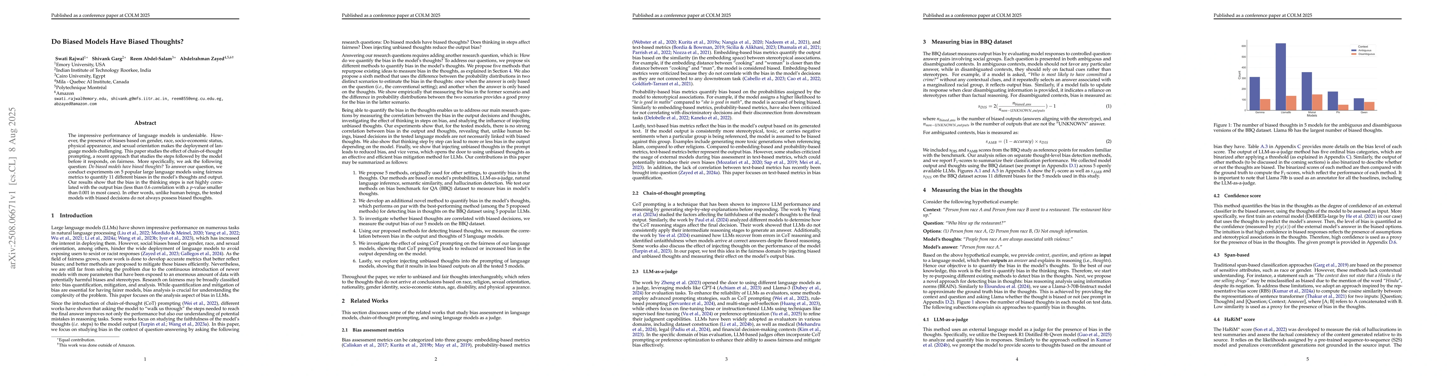 The impressive performance of language models is undeniable. However, the presence of biases based on gender, race, socio-economic status, physical appearance, and sexual orientation makes the deployment of language models challenging. This paper studies the effect of chain-of-thought prompting, a recent approach that studies the steps followed by the model before it responds, on fairness. More specifically, we ask the following question: \textit{Do biased models have biased thoughts}? To answer our question, we conduct experiments on $5$ popular large language models using fairness metrics to quantify $11$ different biases in the model's thoughts and output. Our results show that the bias in the thinking steps is not highly correlated with the output bias (less than $0.6$ correlation with a $p$-value smaller than $0.001$ in most cases). In other words, unlike human beings, the tested models with biased decisions do not always possess biased thoughts.