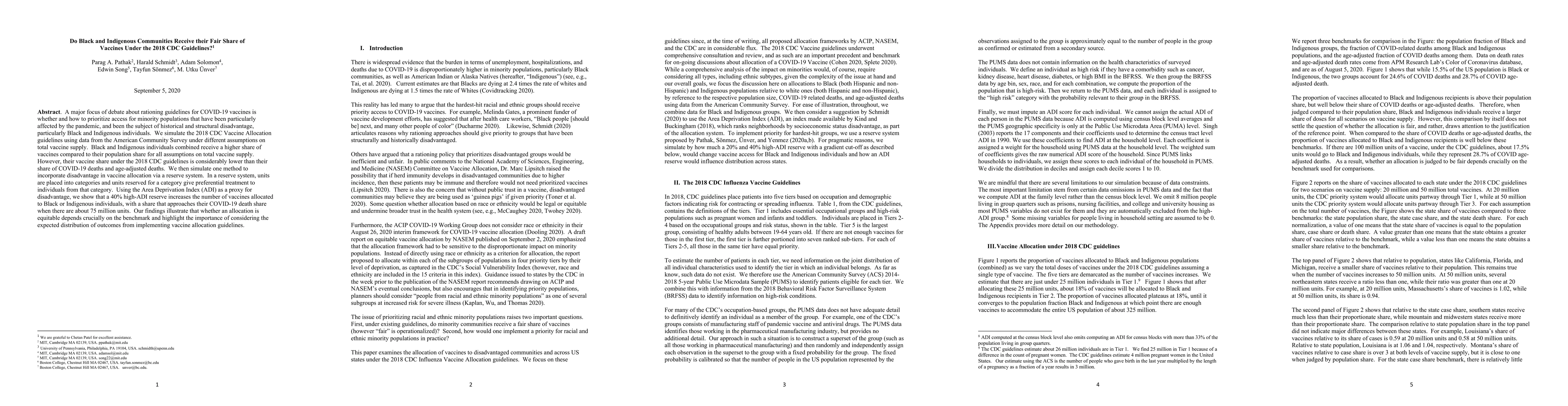 A major focus of debate about rationing guidelines for COVID-19 vaccines is whether and how to prioritize access for minority populations that have been particularly affected by the pandemic, and been the subject of historical and structural disadvantage, particularly Black and Indigenous individuals. We simulate the 2018 CDC Vaccine Allocation guidelines using data from the American Community Survey under different assumptions on total vaccine supply. Black and Indigenous individuals combined receive a higher share of vaccines compared to their population share for all assumptions on total vaccine supply. However, their vaccine share under the 2018 CDC guidelines is considerably lower than their share of COVID-19 deaths and age-adjusted deaths. We then simulate one method to incorporate disadvantage in vaccine allocation via a reserve system. In a reserve system, units are placed into categories and units reserved for a category give preferential treatment to individuals from that category. Using the Area Deprivation Index (ADI) as a proxy for disadvantage, we show that a 40% high-ADI reserve increases the number of vaccines allocated to Black or Indigenous individuals, with a share that approaches their COVID-19 death share when there are about 75 million units. Our findings illustrate that whether an allocation is equitable depends crucially on the benchmark and highlight the importance of considering the expected distribution of outcomes from implementing vaccine allocation guidelines.
