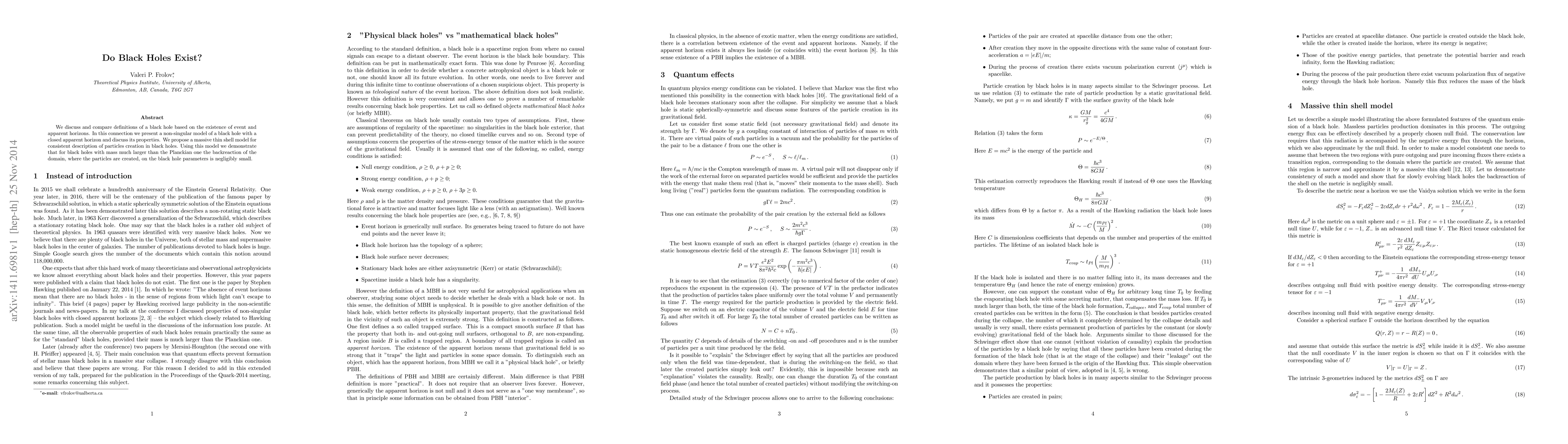 We discuss and compare definitions of a black hole based on the existence of event and apparent horizons. In this connection we present a non-singular model of a black hole with a closed apparent horizon and discuss its properties. We propose a massive thin shell model for consistent description of particles creation in black holes. Using this model we demonstrate that for black holes with mass much larger than the Planckian one the backreaction of the domain, where the particles are created, on the black hole parameters is negligibly small.