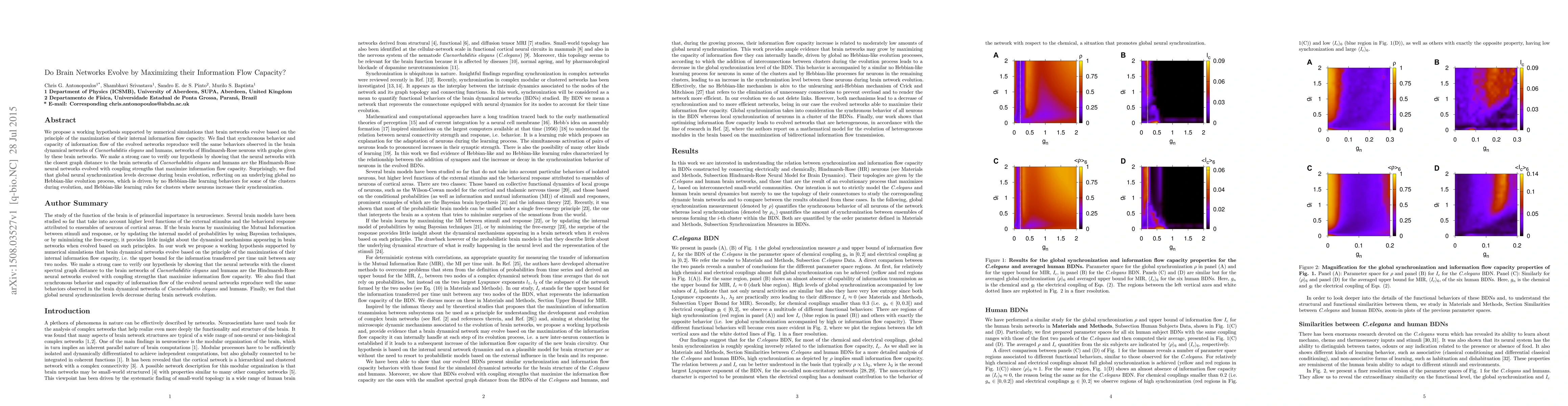 This paper hypothesizes that brain networks evolve to maximize their information flow capacity, supported by simulations showing similar synchronous behaviors in evolved networks and real brain networks. It concludes that global neural synchronization decreases during evolution, driven by non-Hebbian learning rules in some clusters and Hebbian rules in others.