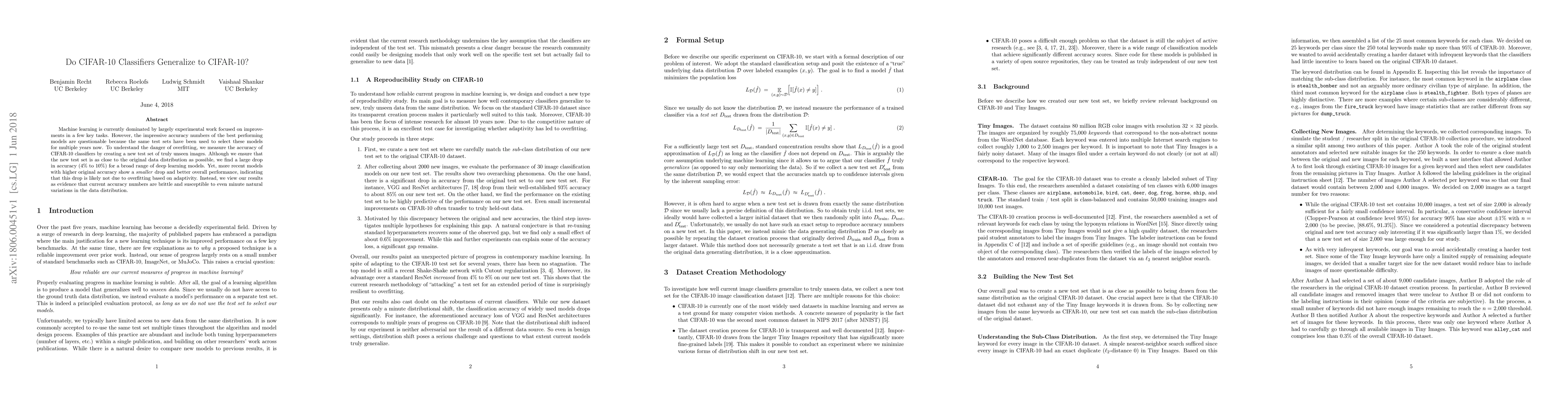 Machine learning is currently dominated by largely experimental work focused on improvements in a few key tasks. However, the impressive accuracy numbers of the best performing models are questionable because the same test sets have been used to select these models for multiple years now. To understand the danger of overfitting, we measure the accuracy of CIFAR-10 classifiers by creating a new test set of truly unseen images. Although we ensure that the new test set is as close to the original data distribution as possible, we find a large drop in accuracy (4% to 10%) for a broad range of deep learning models. Yet more recent models with higher original accuracy show a smaller drop and better overall performance, indicating that this drop is likely not due to overfitting based on adaptivity. Instead, we view our results as evidence that current accuracy numbers are brittle and susceptible to even minute natural variations in the data distribution.