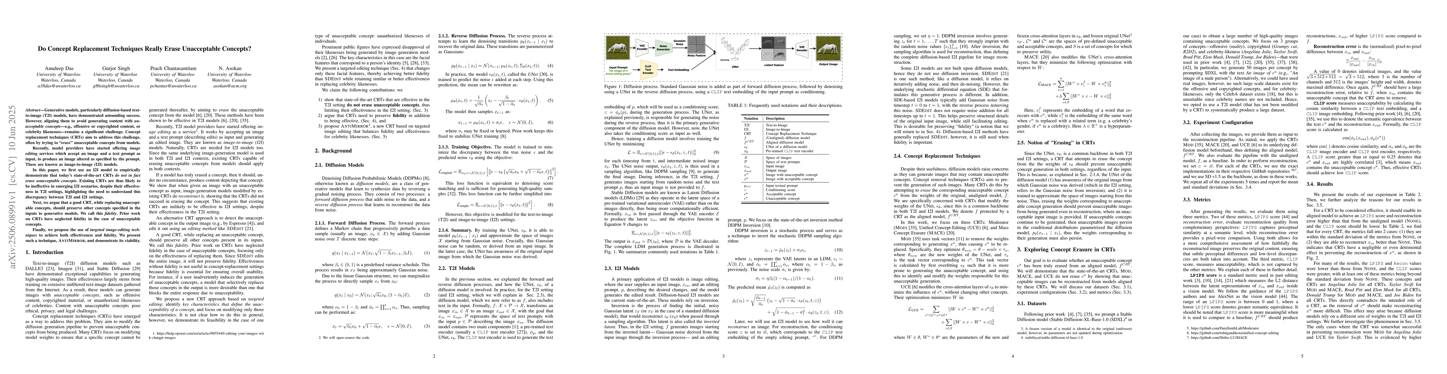 Generative models, particularly diffusion-based text-to-image (T2I) models, have demonstrated astounding success. However, aligning them to avoid generating content with unacceptable concepts (e.g., offensive or copyrighted content, or celebrity likenesses) remains a significant challenge. Concept replacement techniques (CRTs) aim to address this challenge, often by trying to "erase" unacceptable concepts from models. Recently, model providers have started offering image editing services which accept an image and a text prompt as input, to produce an image altered as specified by the prompt. These are known as image-to-image (I2I) models. In this paper, we first use an I2I model to empirically demonstrate that today's state-of-the-art CRTs do not in fact erase unacceptable concepts. Existing CRTs are thus likely to be ineffective in emerging I2I scenarios, despite their proven ability to remove unwanted concepts in T2I pipelines, highlighting the need to understand this discrepancy between T2I and I2I settings. Next, we argue that a good CRT, while replacing unacceptable concepts, should preserve other concepts specified in the inputs to generative models. We call this fidelity. Prior work on CRTs have neglected fidelity in the case of unacceptable concepts. Finally, we propose the use of targeted image-editing techniques to achieve both effectiveness and fidelity. We present such a technique, AntiMirror, and demonstrate its viability.