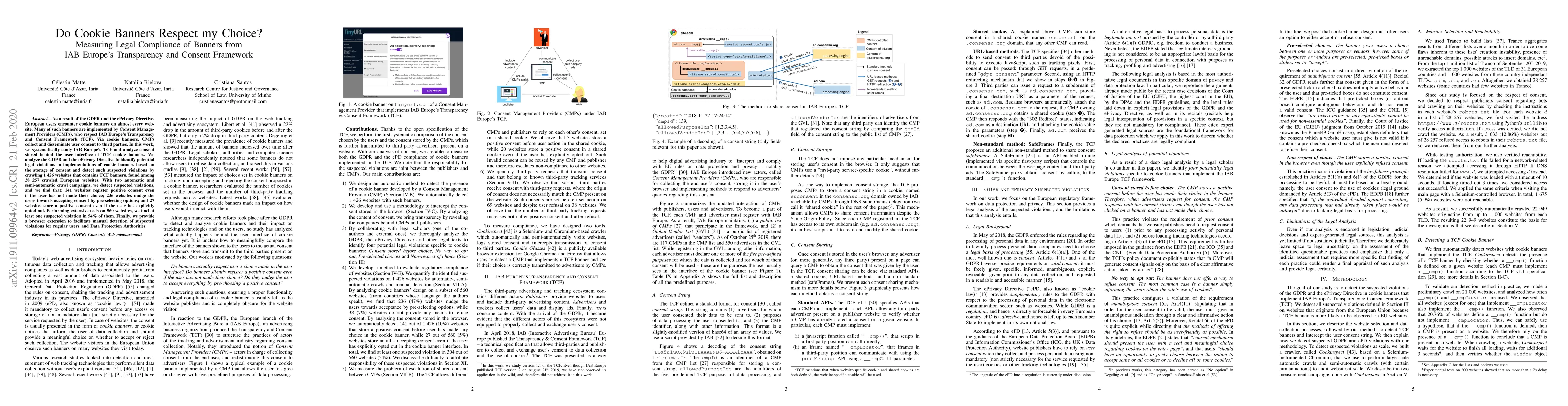 This paper investigates the legal compliance of cookie banners with GDPR and ePrivacy Directive, finding that many consent management systems violate user choice by pre-selecting options, registering consent without user input, and storing consent after explicit opt-outs. The study crawls 22,949 European websites and identifies violations in 54% of tested sites.
