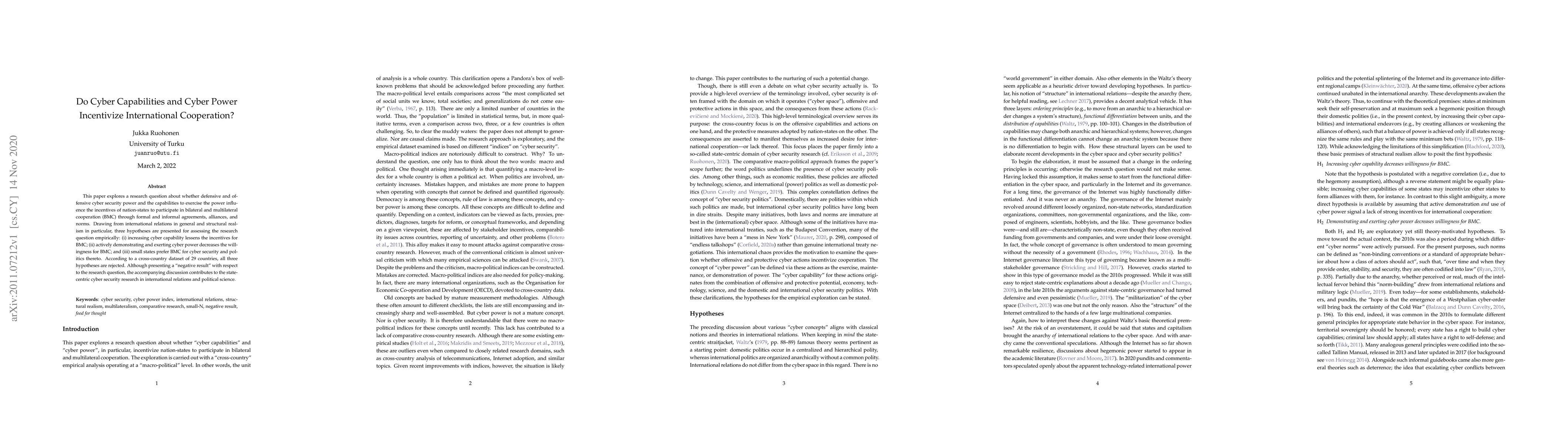 This paper explores a research question about whether defensive and offensive cyber security power and the capabilities to exercise the power influence the incentives of nation-states to participate in bilateral and multilateral cooperation (BMC) through formal and informal agreements, alliances, and norms. Drawing from international relations in general and structural realism in particular, three hypotheses are presented for assessing the research question empirically: (i) increasing cyber capability lessens the incentives for BMC; (ii) actively demonstrating and exerting cyber power decreases the willingness for BMC; and (iii) small states prefer BMC for cyber security and politics thereto. According to a cross-country dataset of 29 countries, all three hypotheses are rejected. Although presenting a "negative result" with respect to the research question, the accompanying discussion contributes to the state-centric cyber security research in international relations and political science.