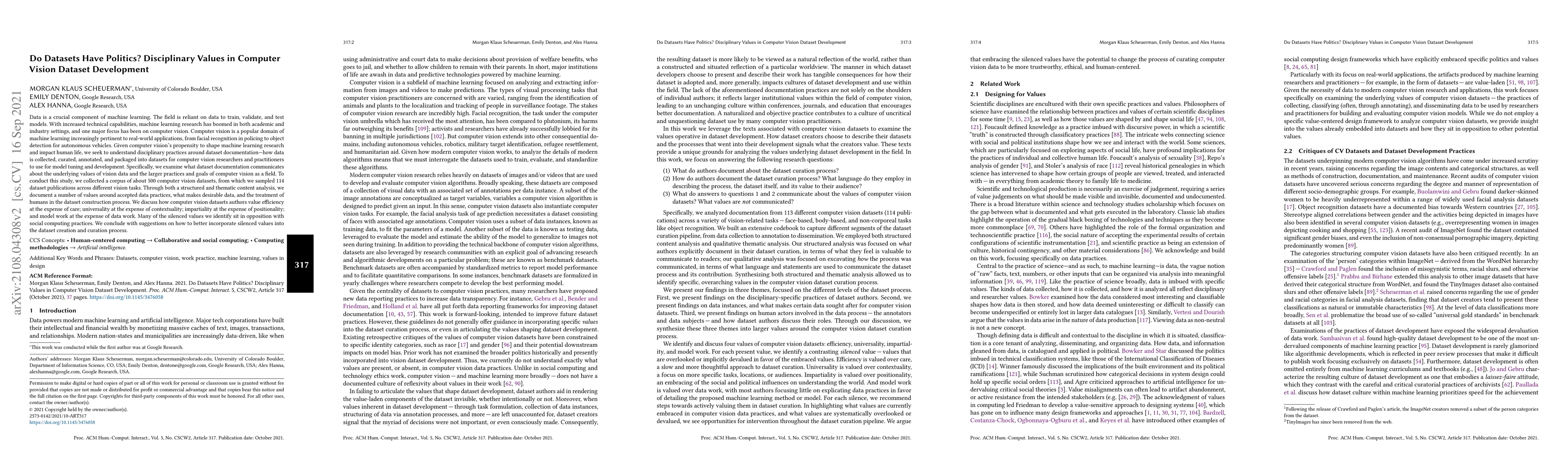 This paper investigates the disciplinary values embedded in computer vision datasets, revealing how dataset documentation reflects underlying values and practices. It finds that efficiency, universality, and impartiality often overshadow contextuality, care, and positionality, leading to ethical concerns in data collection and curation.