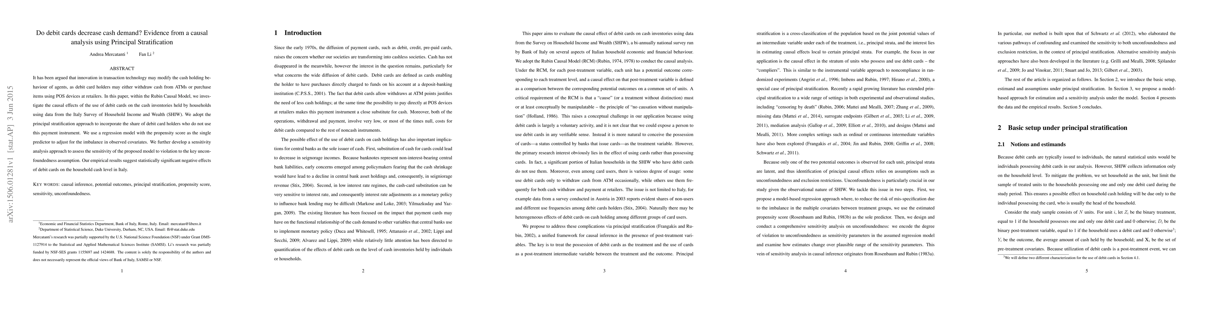 Debit card usage is linked to lower household cash levels in Italy, according to a study that controlled for confounding factors using Principal Stratification. The findings suggest that debit cards may alter cash holding behavior, potentially decreasing demand for cash.