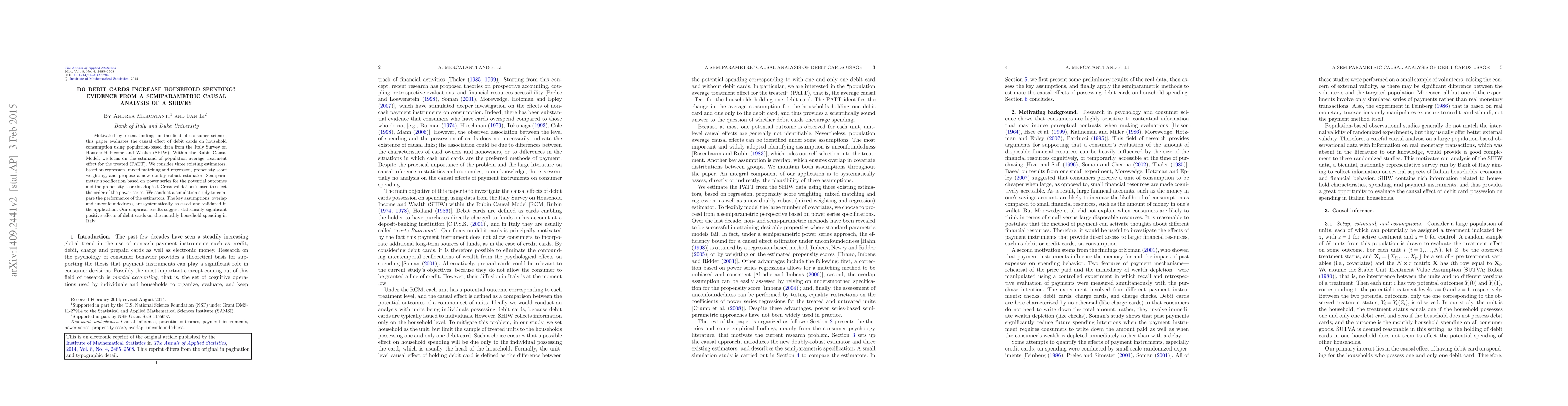This paper uses survey data to investigate whether debit cards increase household spending, finding statistically significant positive effects on monthly spending in Italy. It proposes a new estimator for analyzing the causal effect of debit cards.