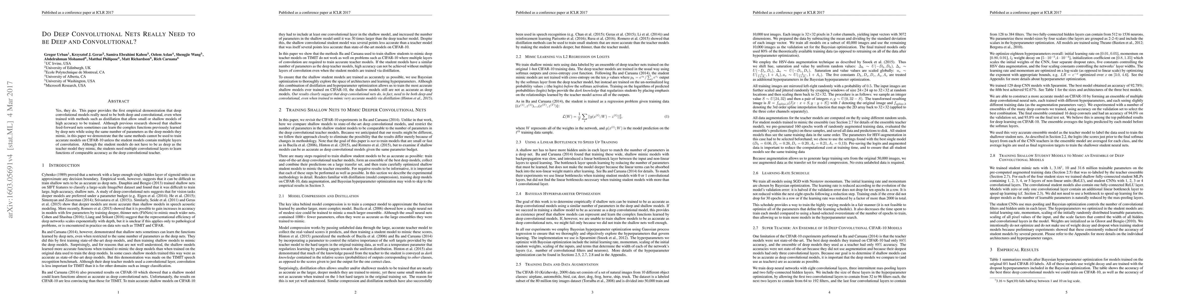 This paper empirically demonstrates that deep convolutional models must be both deep and convolutional to achieve high accuracy, even when trained with techniques like distillation. While shallow feed-forward networks can sometimes mimic deep networks' performance, this is not the case for convolutional models on CIFAR-10 unless they include multiple convolutional layers.