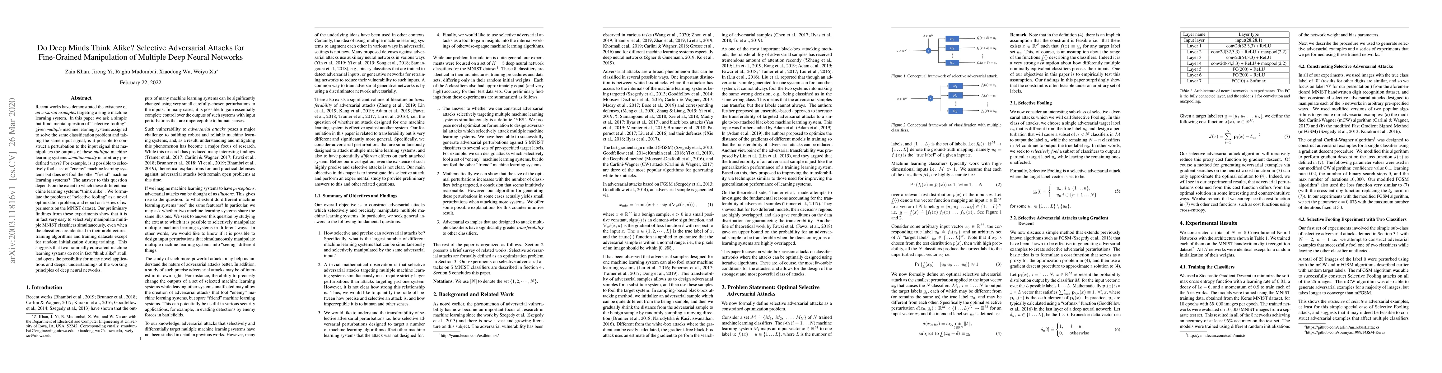Recent works have demonstrated the existence of {\it adversarial examples} targeting a single machine learning system. In this paper we ask a simple but fundamental question of "selective fooling": given {\it multiple} machine learning systems assigned to solve the same classification problem and taking the same input signal, is it possible to construct a perturbation to the input signal that manipulates the outputs of these {\it multiple} machine learning systems {\it simultaneously} in arbitrary pre-defined ways? For example, is it possible to selectively fool a set of "enemy" machine learning systems but does not fool the other "friend" machine learning systems? The answer to this question depends on the extent to which these different machine learning systems "think alike". We formulate the problem of "selective fooling" as a novel optimization problem, and report on a series of experiments on the MNIST dataset. Our preliminary findings from these experiments show that it is in fact very easy to selectively manipulate multiple MNIST classifiers simultaneously, even when the classifiers are identical in their architectures, training algorithms and training datasets except for random initialization during training. This suggests that two nominally equivalent machine learning systems do not in fact "think alike" at all, and opens the possibility for many novel applications and deeper understandings of the working principles of deep neural networks.